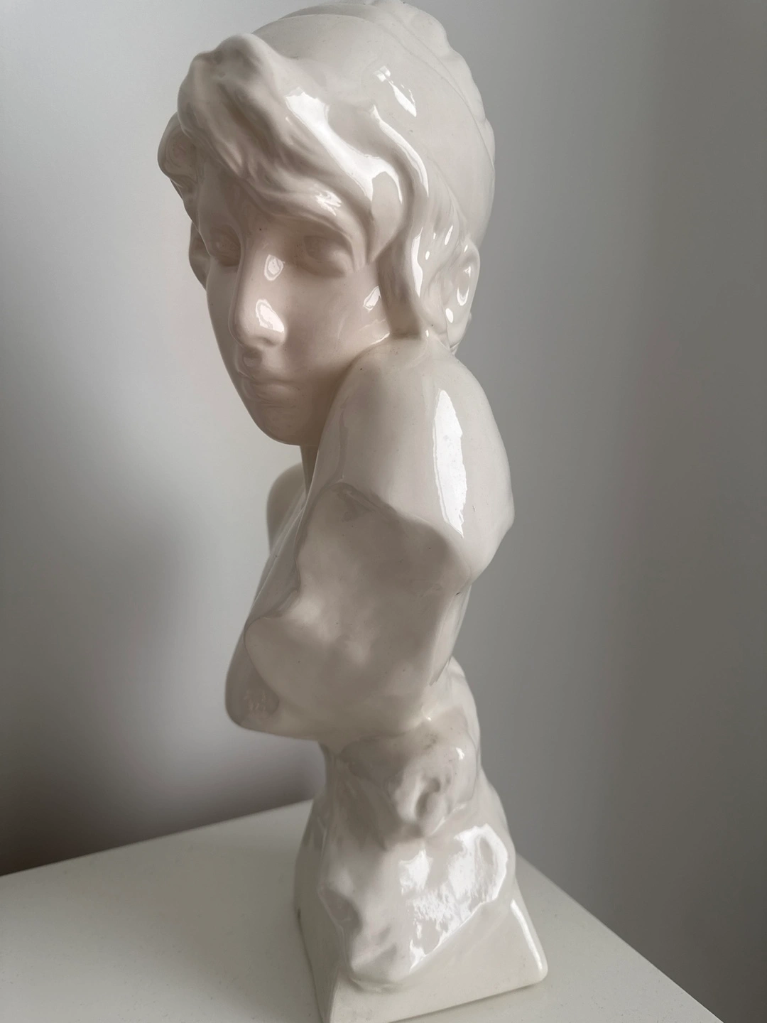 Elegant white ceramic bust. Features a female figure. Unique home decor piece. Great for shelves or room decor.