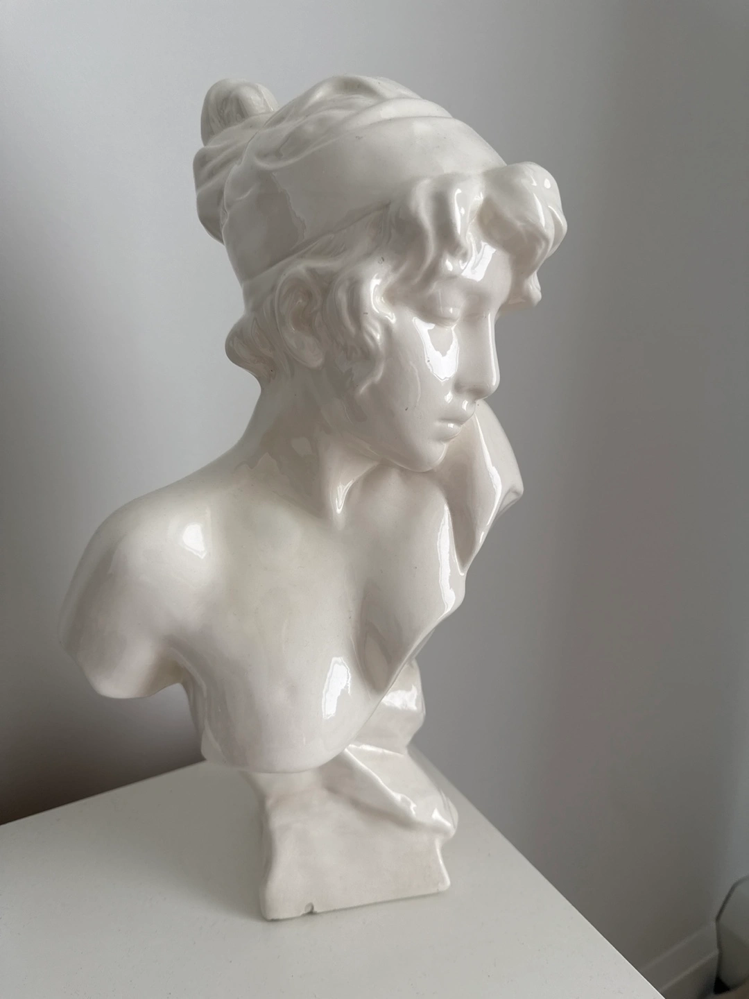 Elegant white ceramic bust. Features a female figure. Unique home decor piece. Great for shelves or room decor.