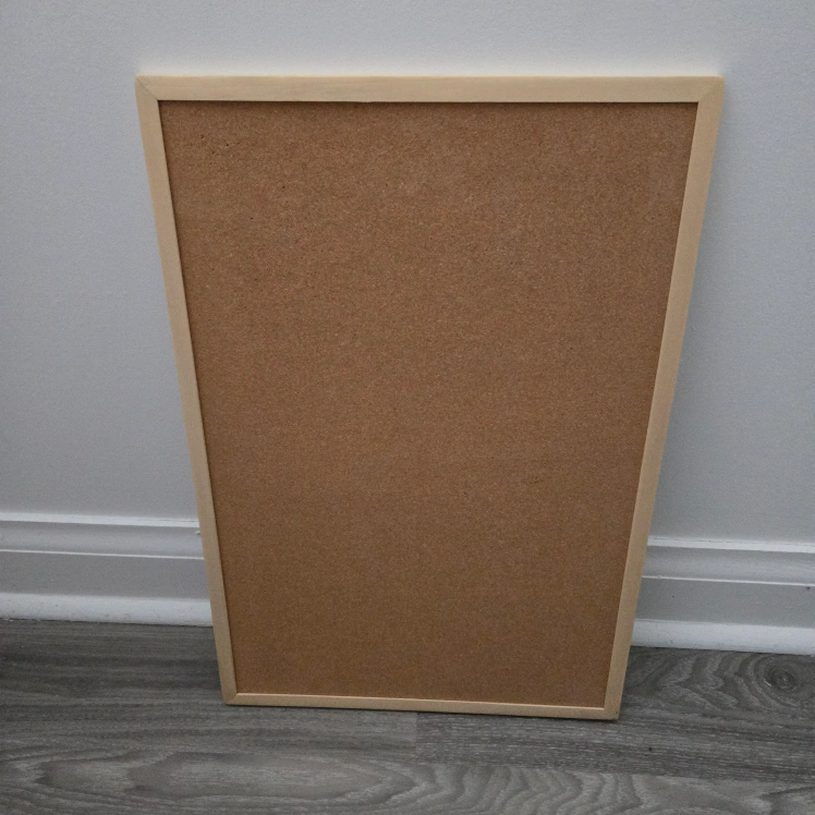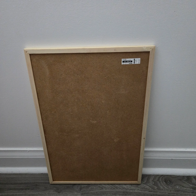Ikea corkboard, perfect for organizing notes and mementos. Features a light-coloured wooden frame.