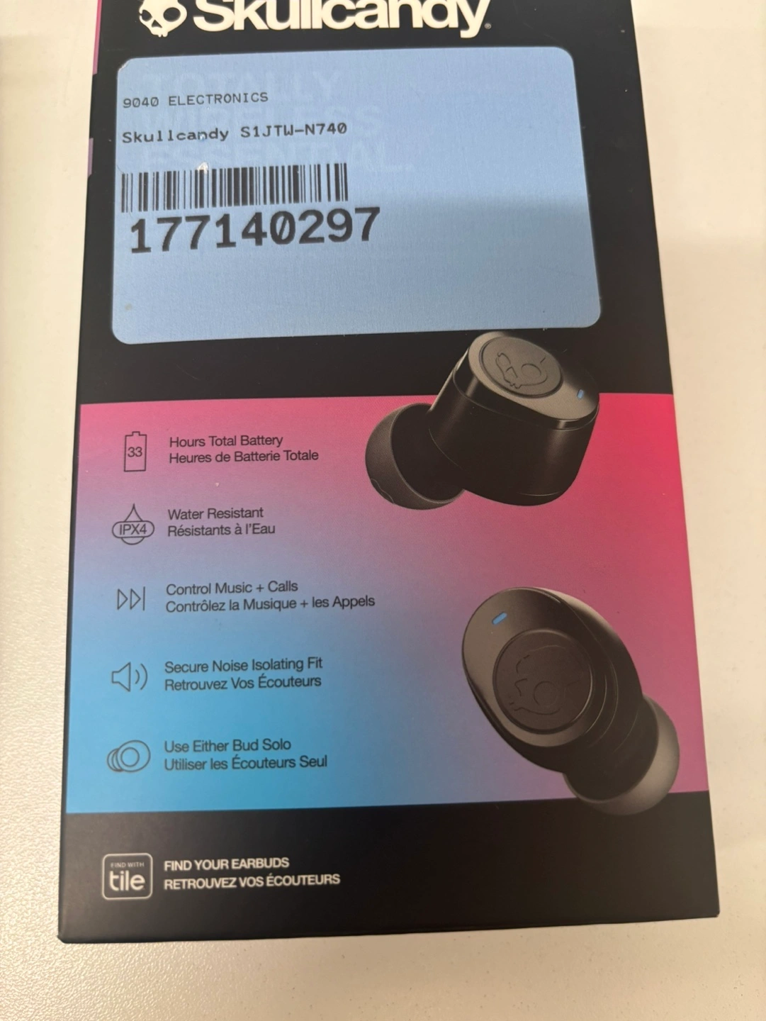 Brand new, sealed Skullcandy earbuds. Features 33 hours of total battery life, IPX4 water resistance, secure noise-isolating fit, and control music and calls. Use either bud solo. Find your earbuds with Tile.