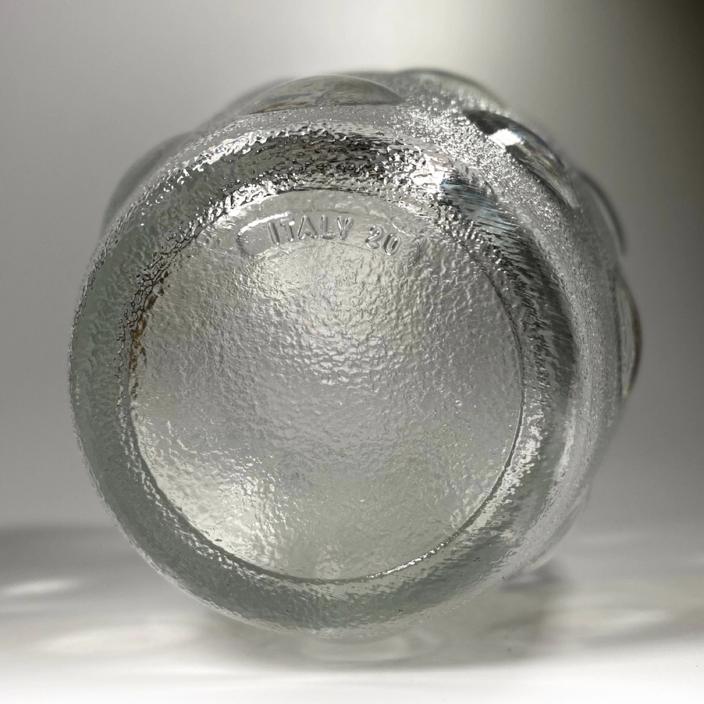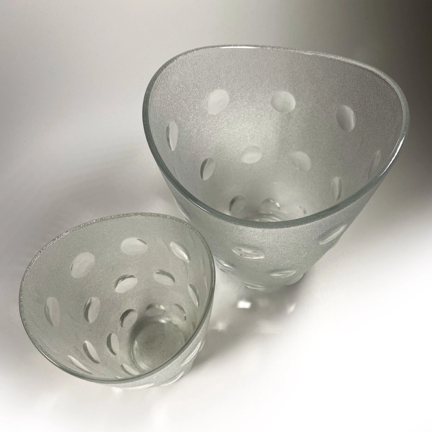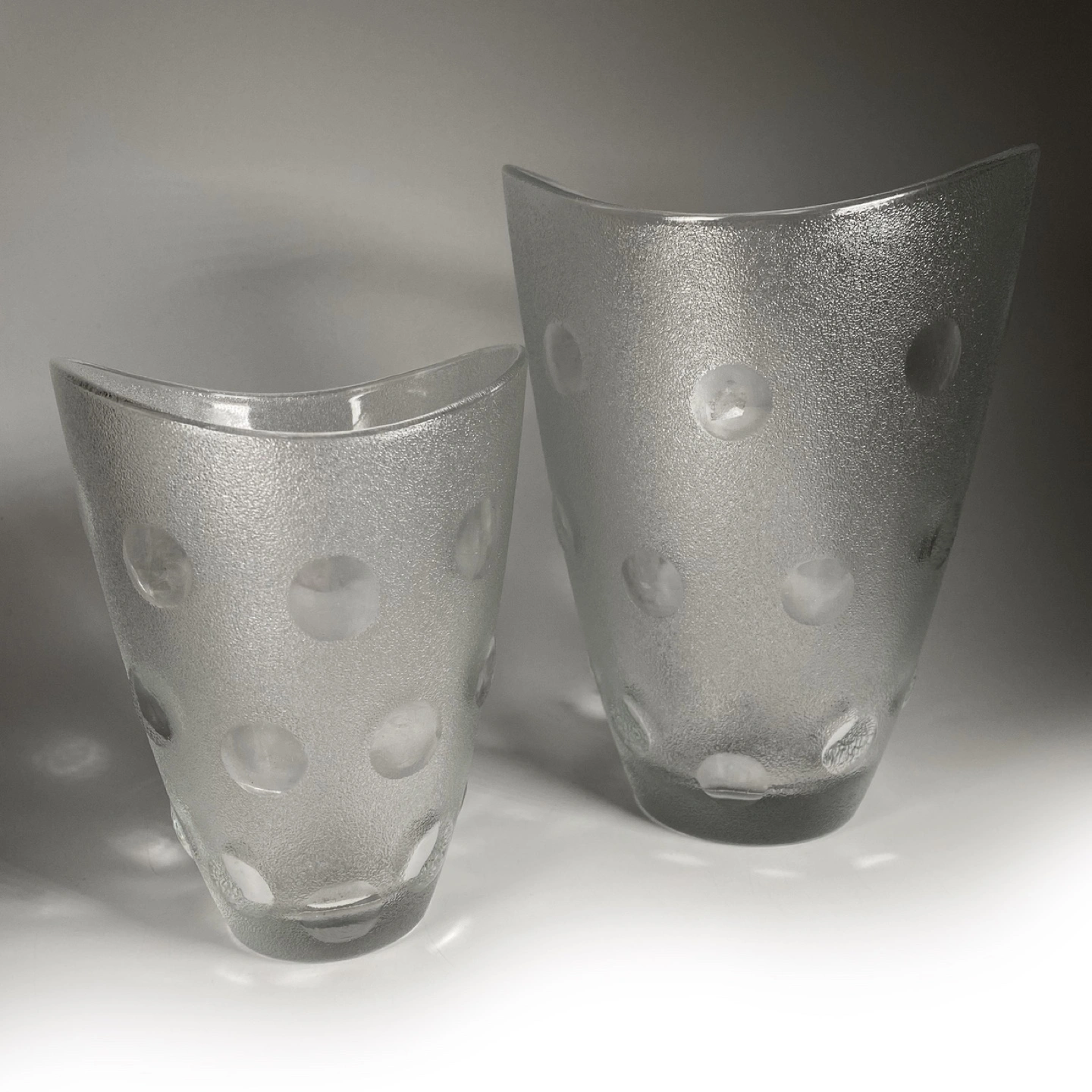 Pair of vintage 1970βs Veteria di Borgonovo Italian frosted glass polka dot table vases.