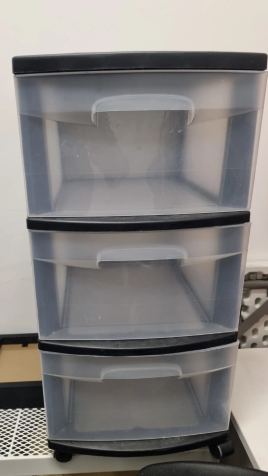 Clear plastic three-drawer organizer. Black trim. Small wheels for mobility. Great for organizing small items.