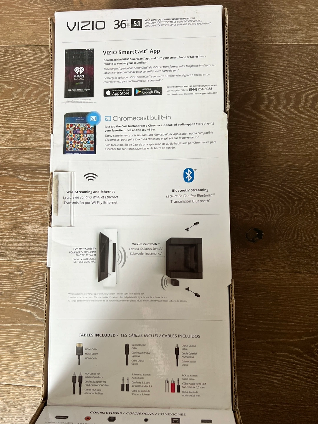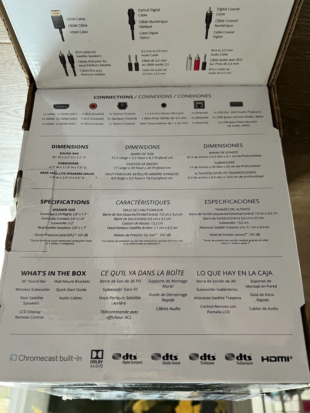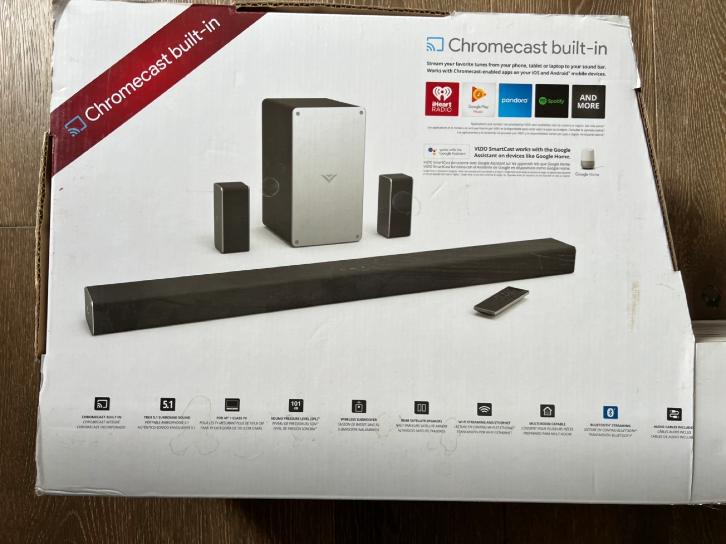 New condition VIZIO 36-inch 5.1 SmartCast sound bar system. Features Chromecast built-in, Bluetooth streaming, and works with Google Assistant. Includes wireless subwoofer and two rear satellite speakers. Complete with all cables and remote.