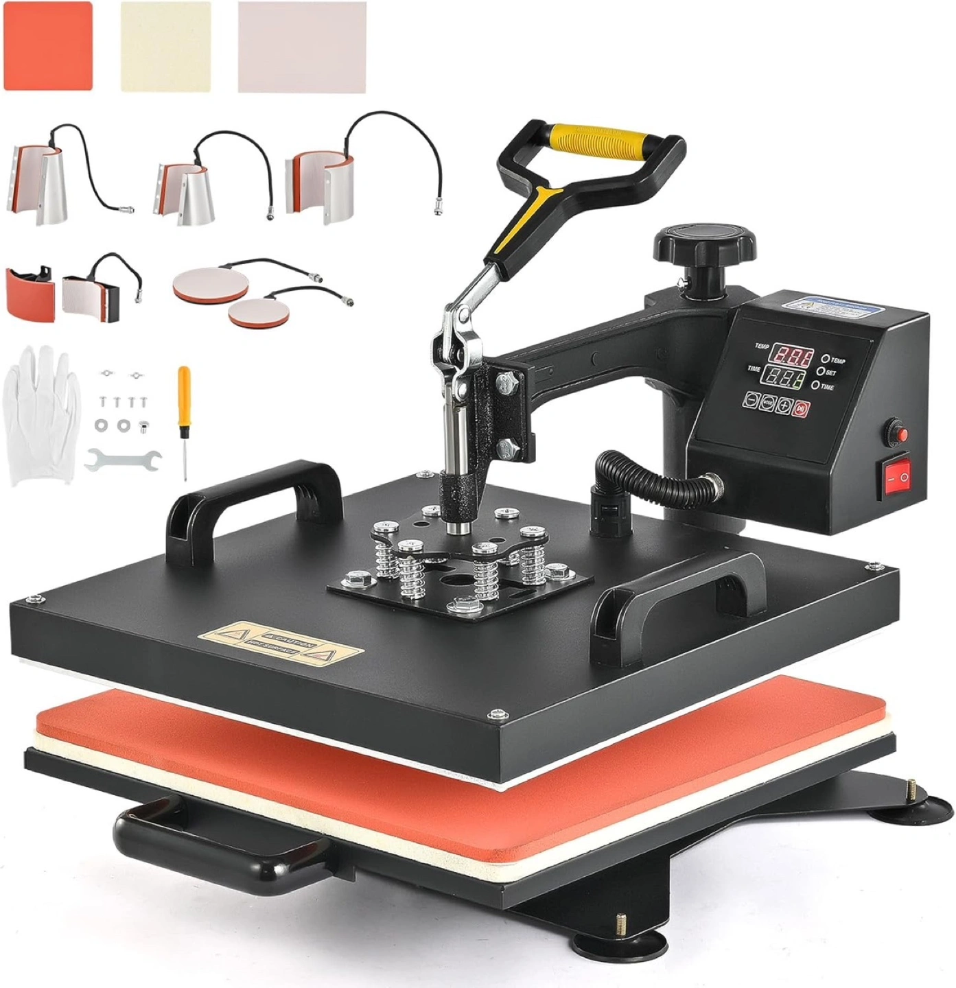 8-in-1 heat press machine. Includes attachments for t-shirts, hats, plates, and mugs. 15x15 inch platen. Great for customizing apparel and other items. Includes Teflon sheet and other accessories.