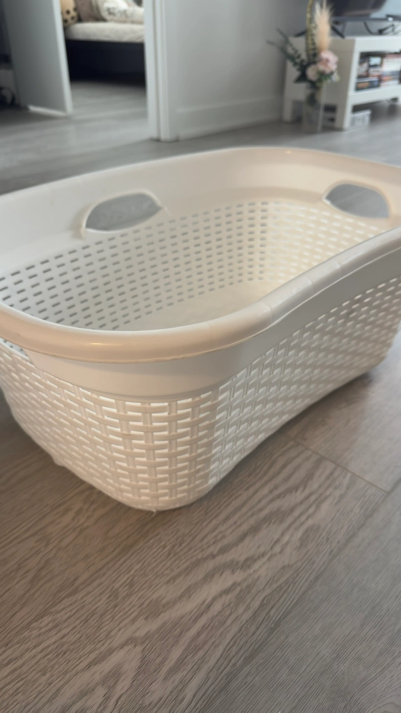 White plastic laundry basket. Great for organizing laundry or storing items. Lightweight and easy to carry. Features a woven design. Condition: barely used