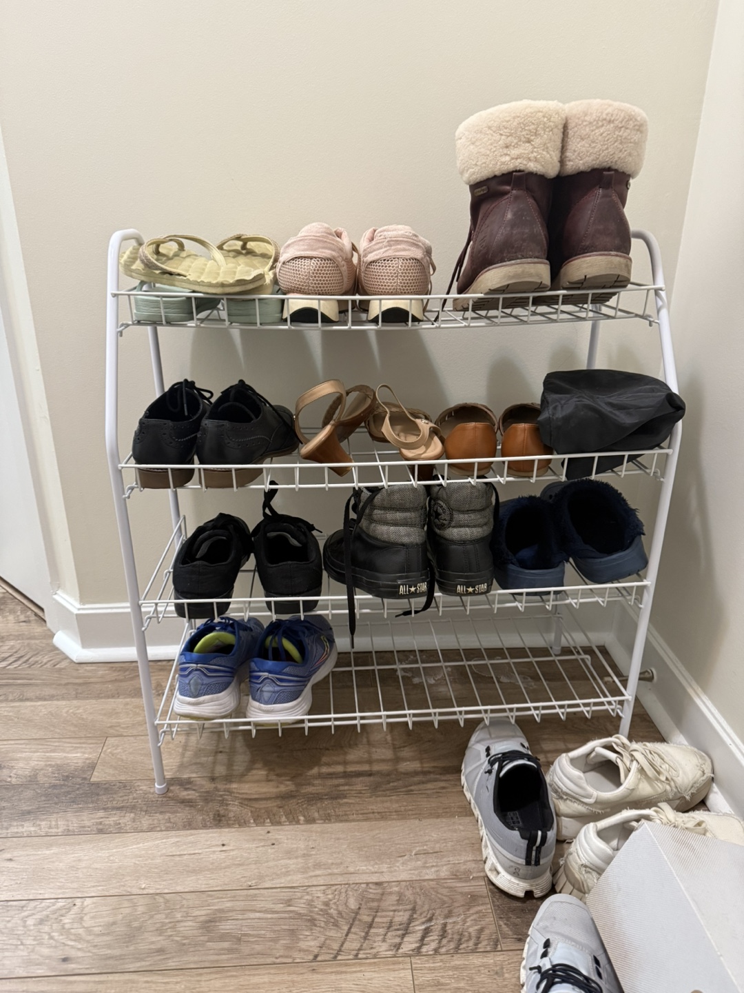 Four-tier shoe rack, white metal frame. Holds various shoes, boots, and sandals. Good for entryway organization.
