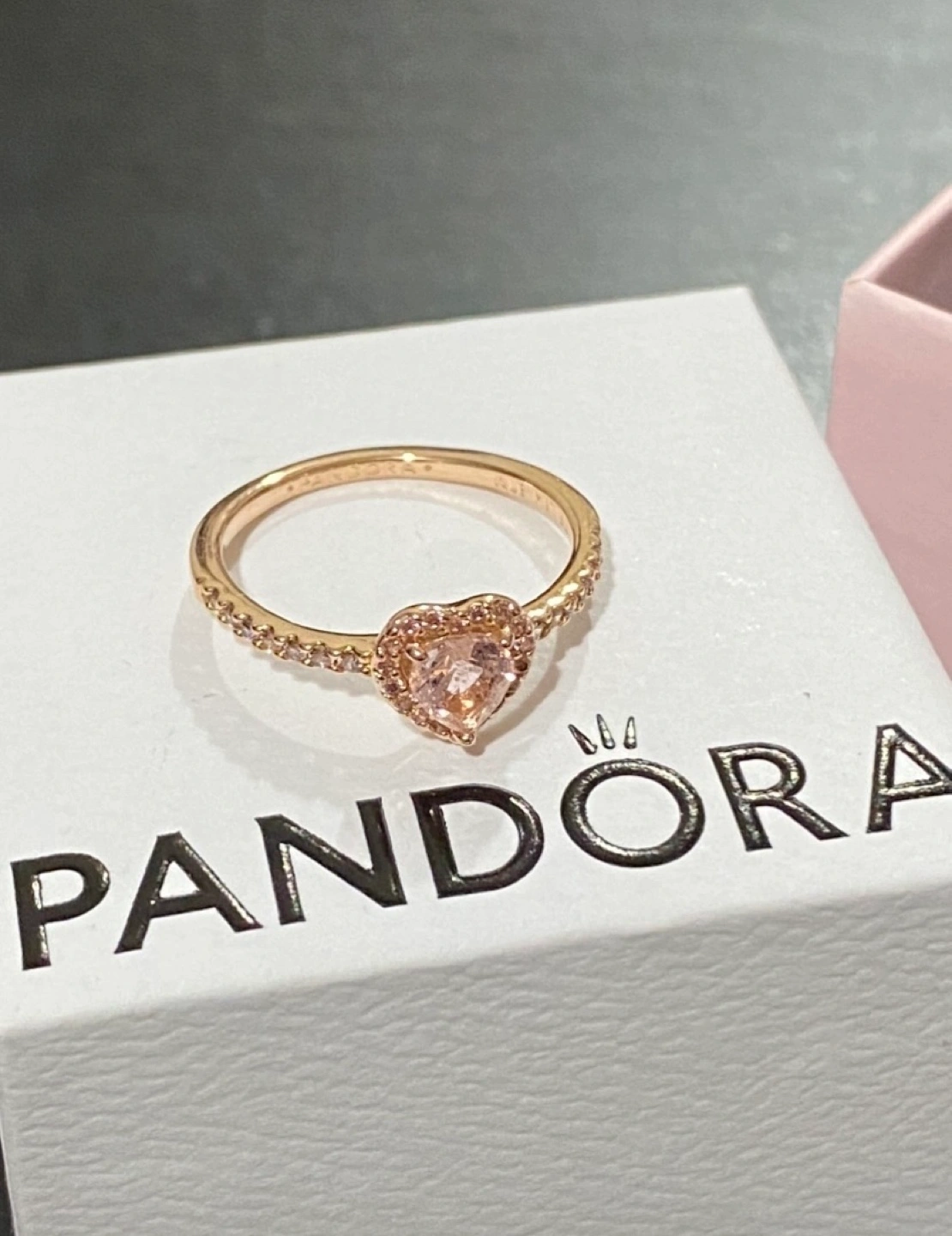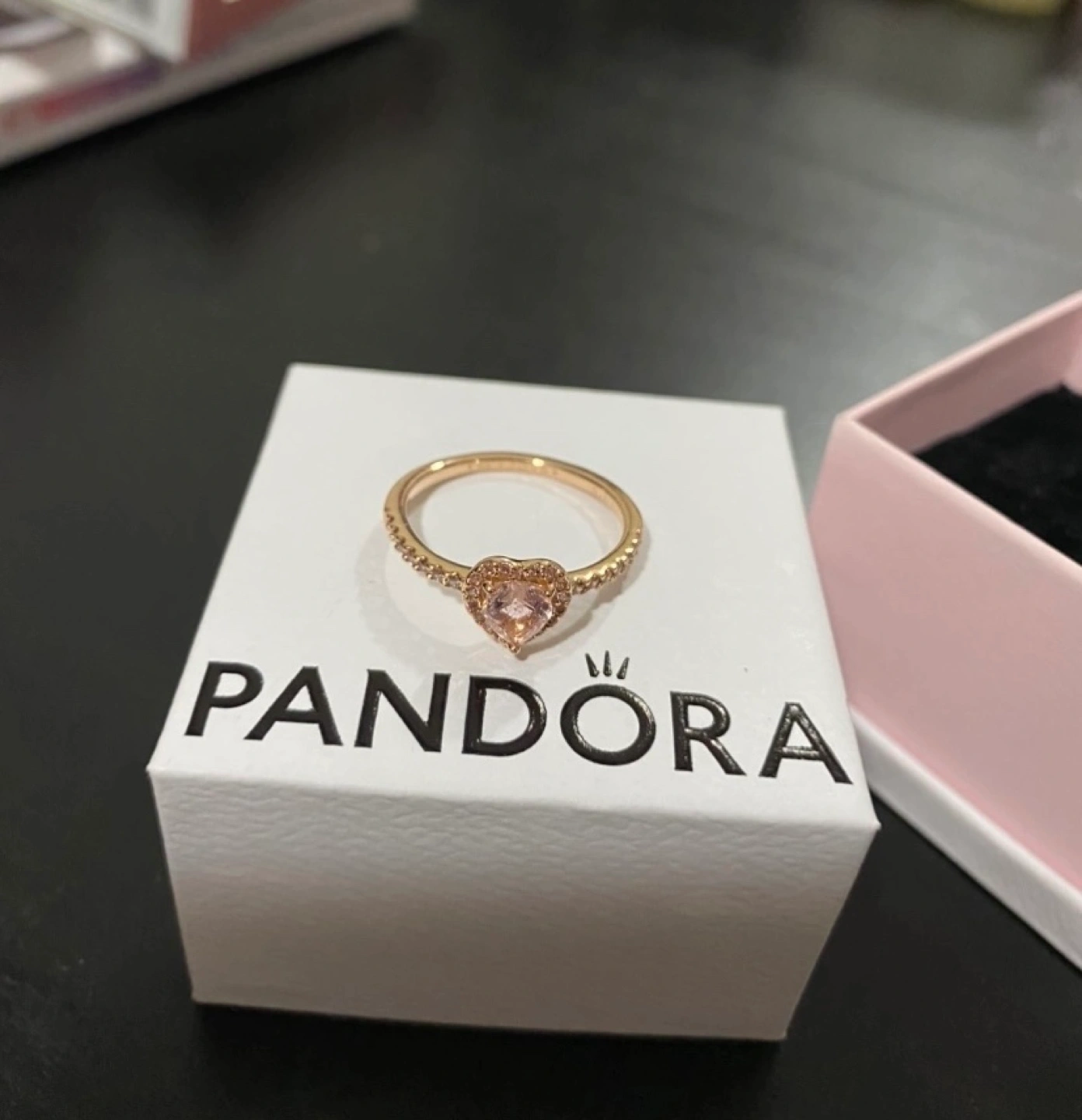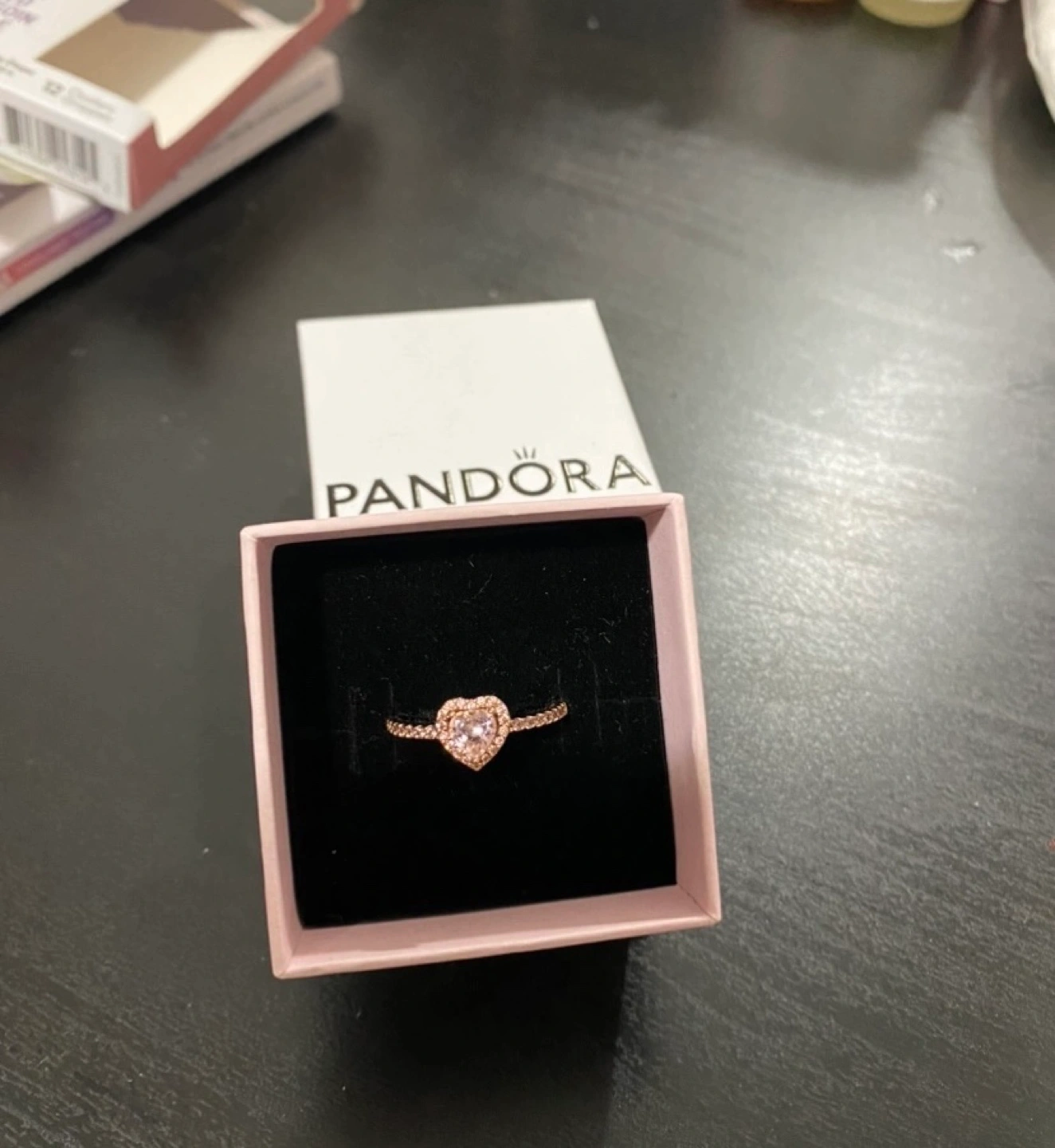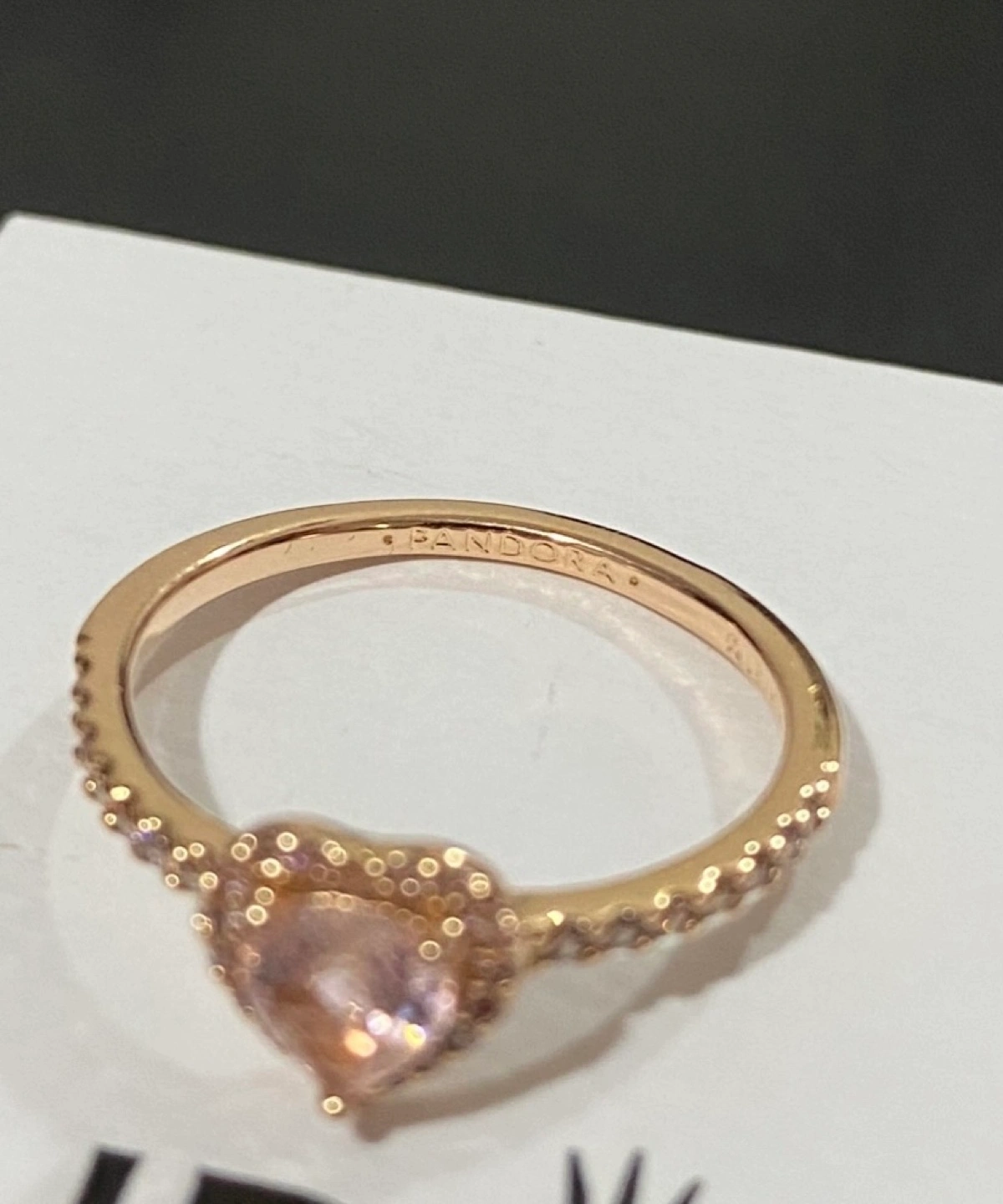 Beautiful rose gold ring. Features a heart-shaped pink stone, surrounded by smaller clear stones. Comes in original Pandora box.