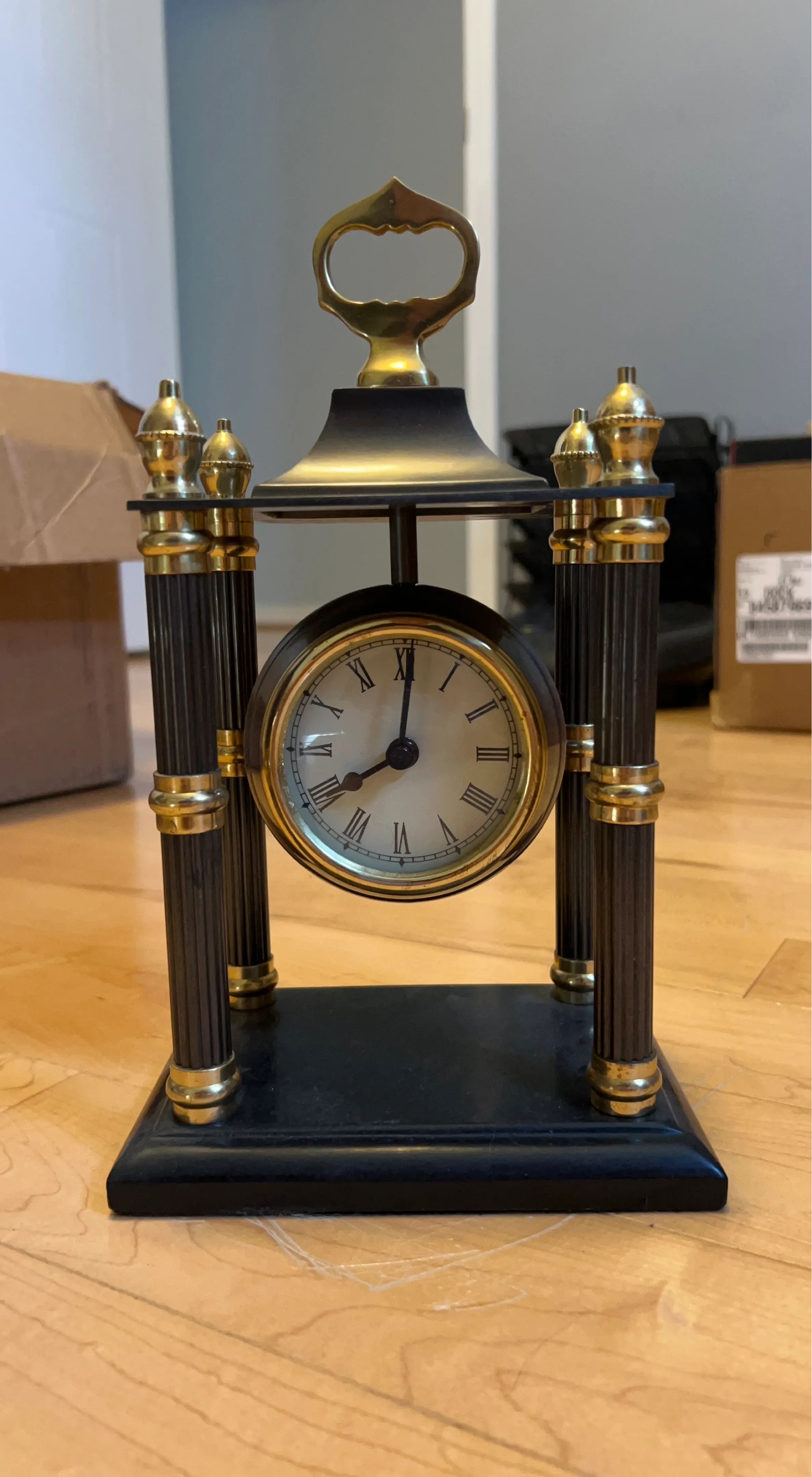 A decorative mantel clock with Roman numerals. Features a dark finish with brass accents and a carrying handle. It's approximately 12 inches tall.