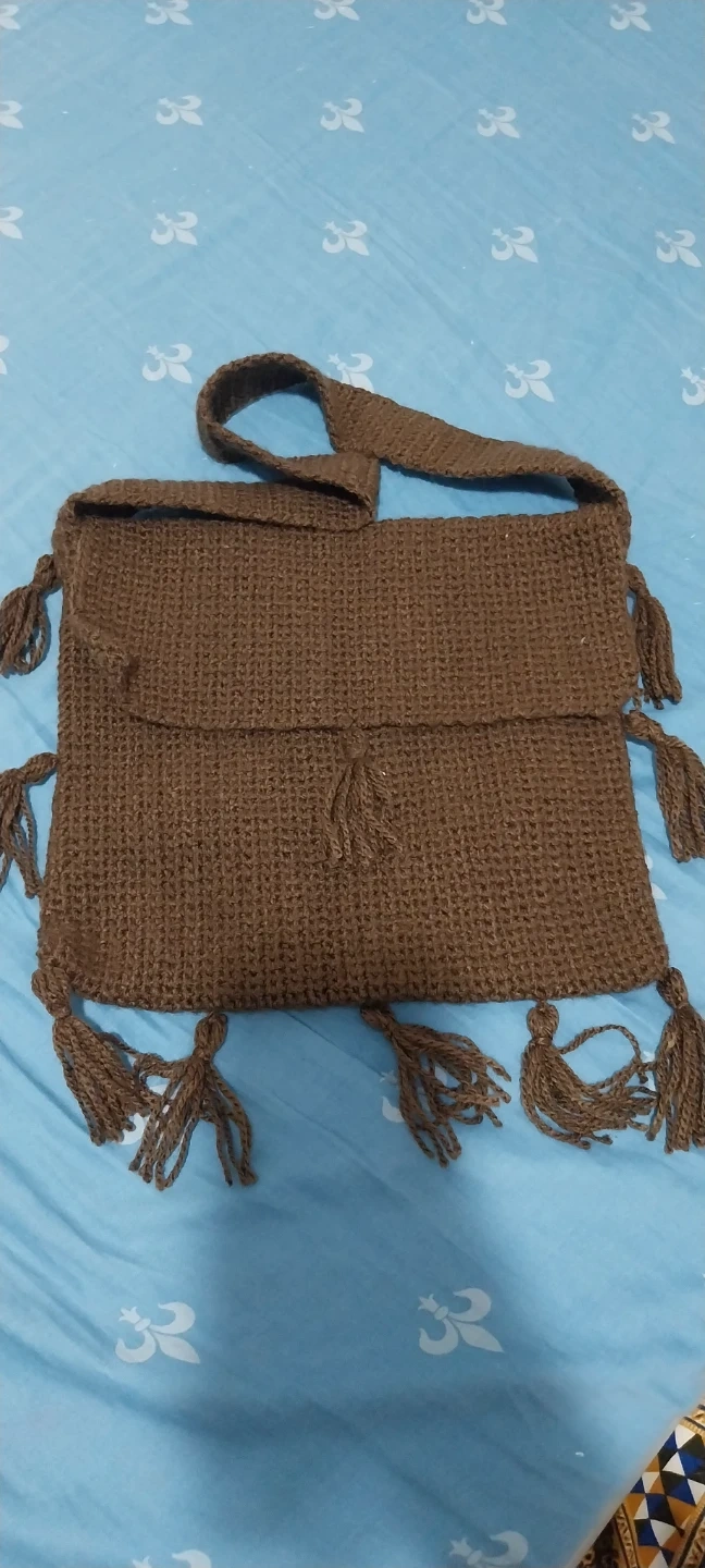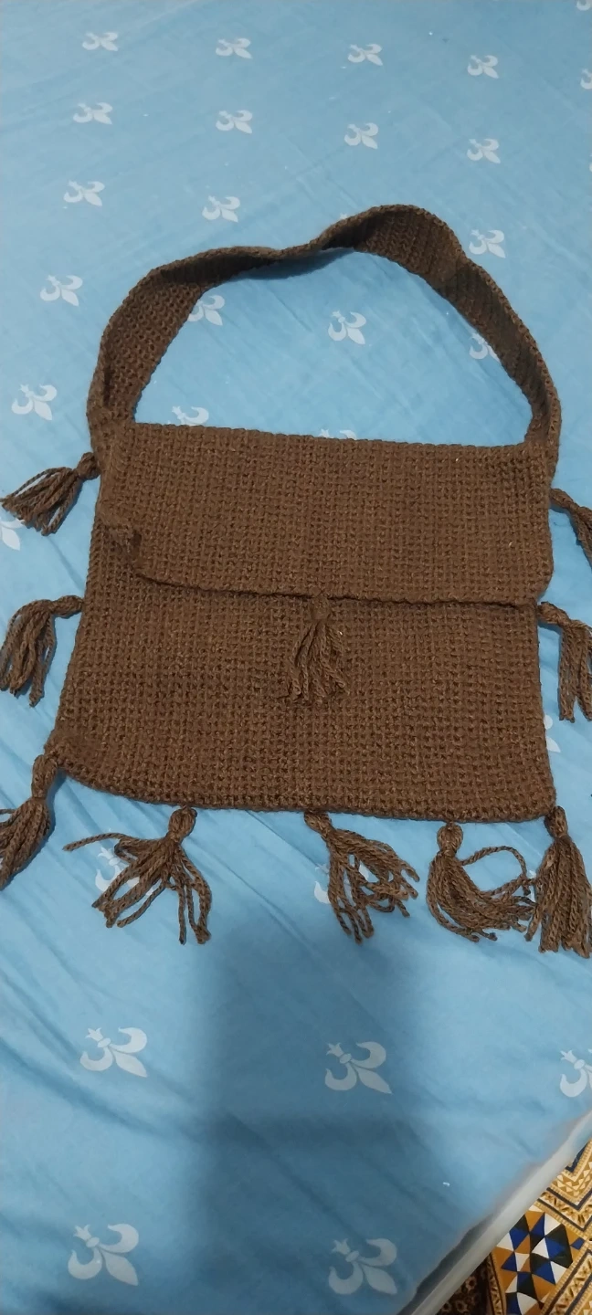 A lovely brown crocheted bag, perfect for everyday use. It features a secure flap closure and decorative tassels on the sides and bottom. This bag's durable crochet construction makes it a stylish and practical accessory. It's great for carrying essentials while adding a boho touch to any outfit!