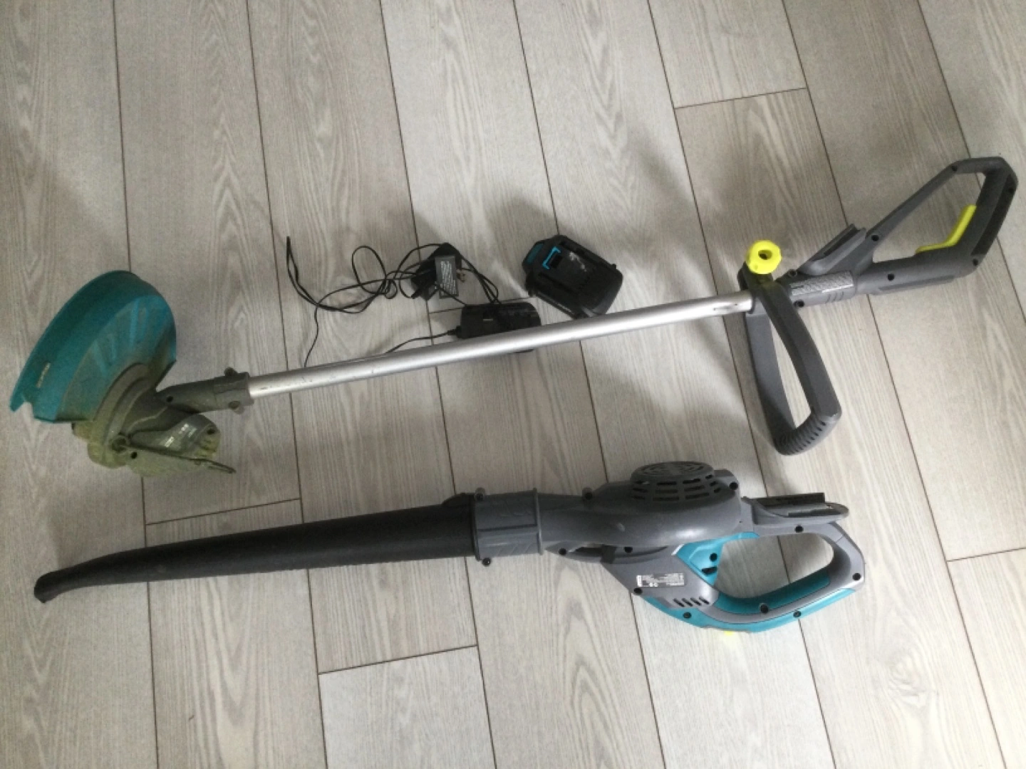 This is a Greenworks cordless string trimmer and leaf blower combo set. It includes the trimmer, the blower attachment, a battery, and a charger. It's great for tidying up your yard!