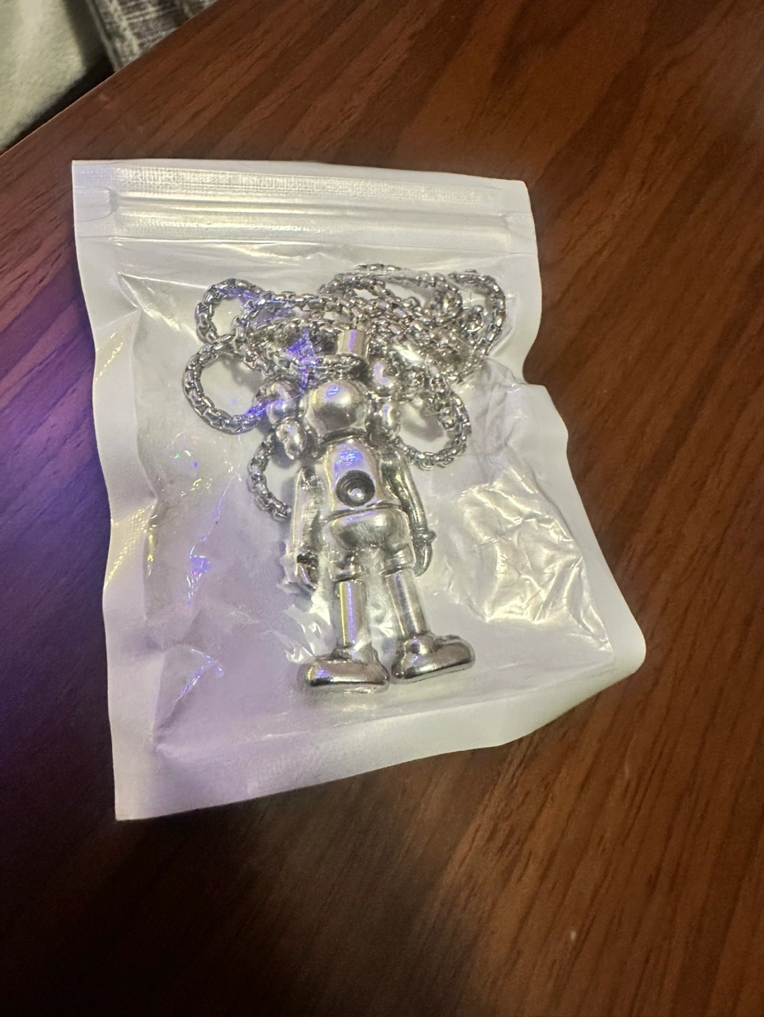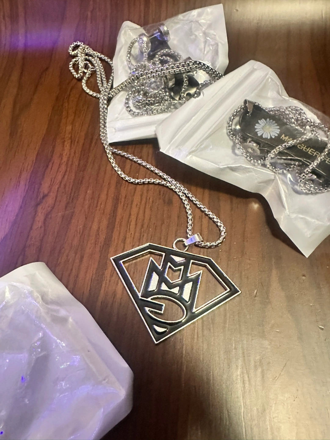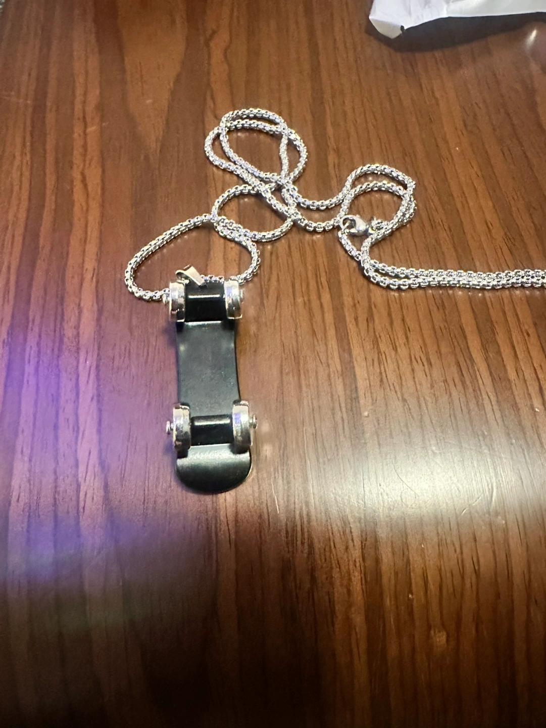 Three necklaces with different pendants. One features a miniature skateboard, another a logo, and the last a stylized figure. Silver chains included. New, never worn.