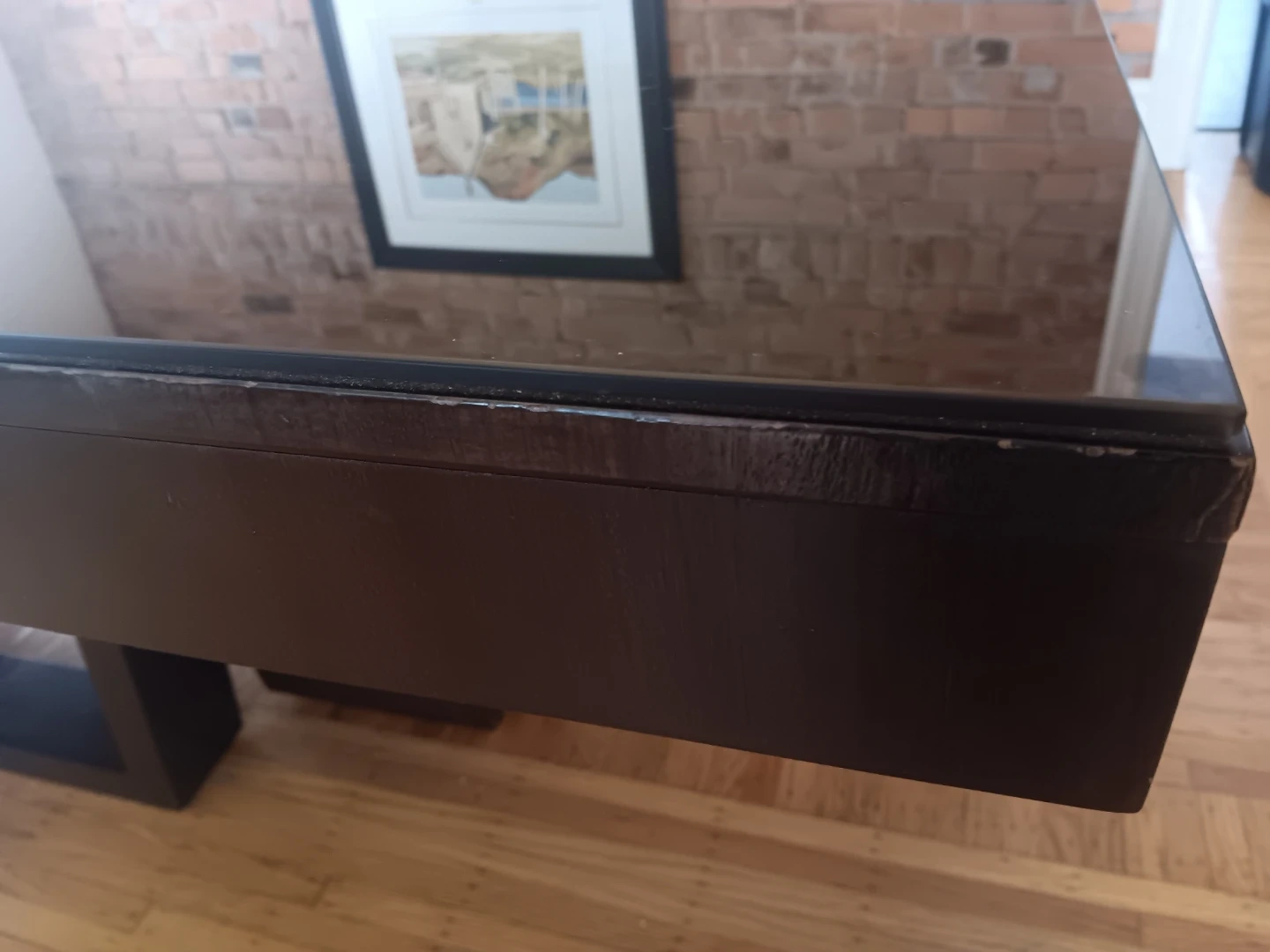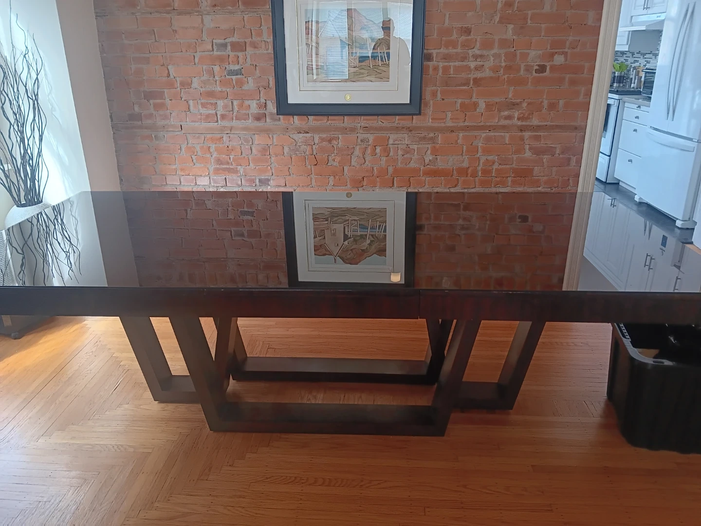 A dark wood dining table with a reflective glass top. It has a unique angular leg design. This table offers ample dining space for gatherings.