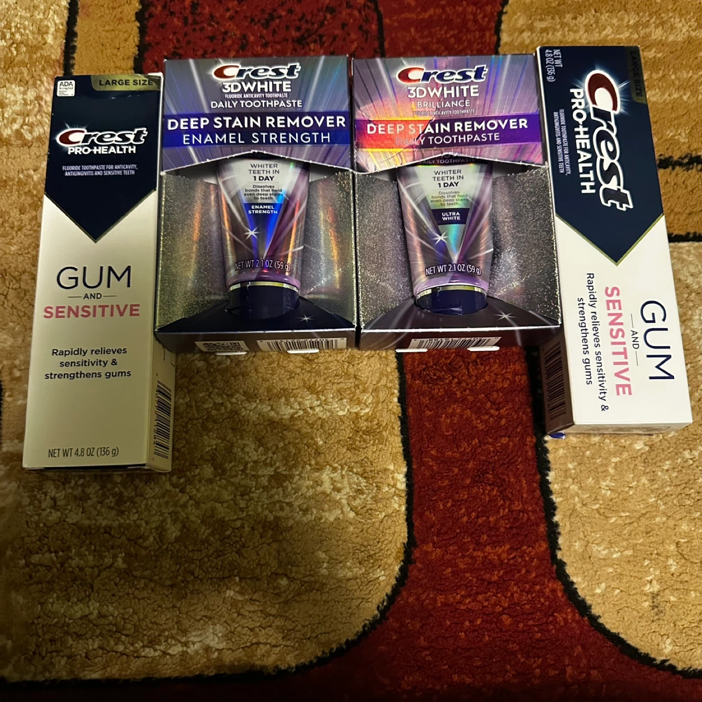 This bundle includes Crest Pro-Health Gum & Sensitive toothpaste and two tubes of Crest 3D White Deep Stain Remover toothpaste. Each tube is 2.1 oz (59g). This toothpaste is designed to relieve sensitivity and strengthen gums while also removing stains for whiter teeth.