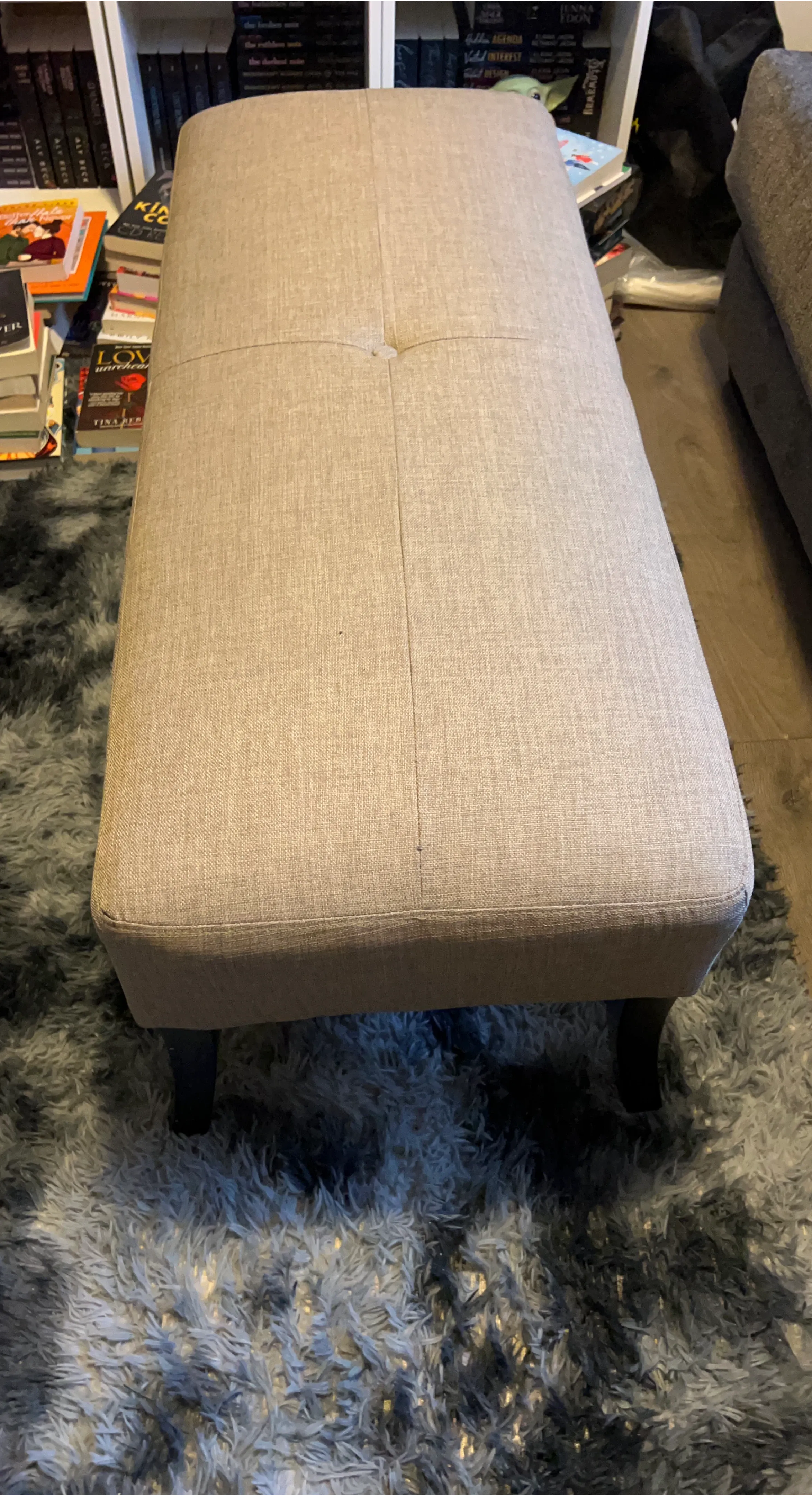 This is a beige upholstered ottoman bench. It has a button tufted top and dark wooden legs. It's suitable for use as an accent piece or for extra seating.