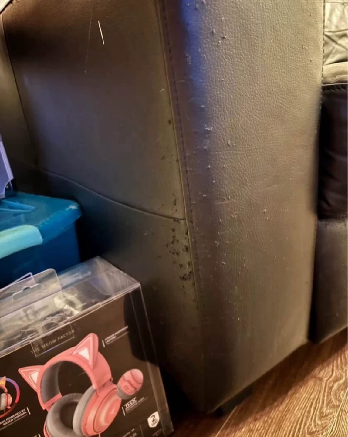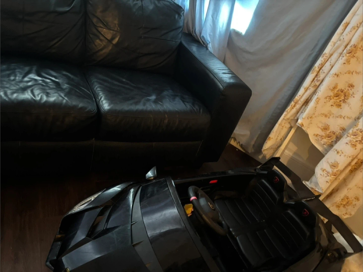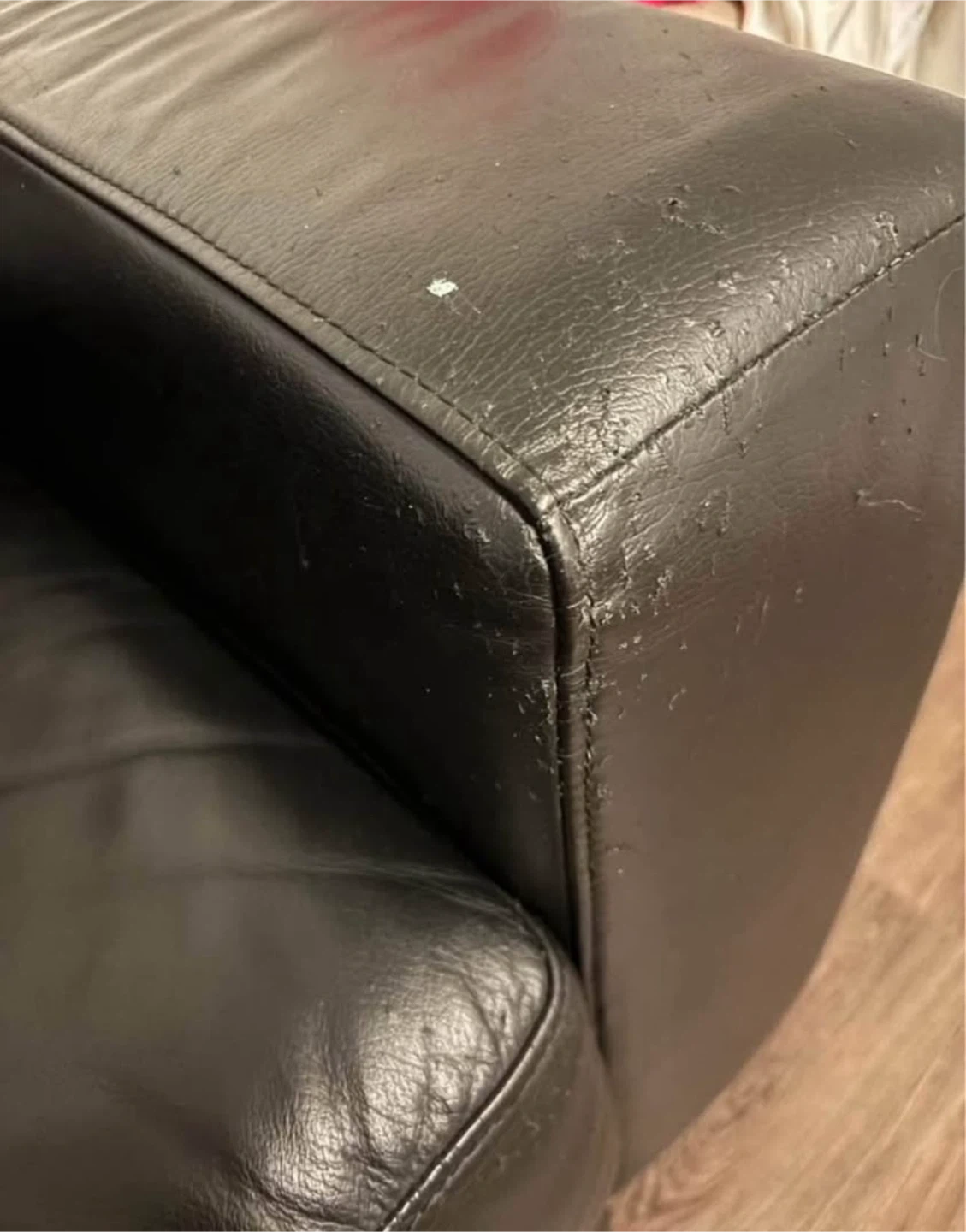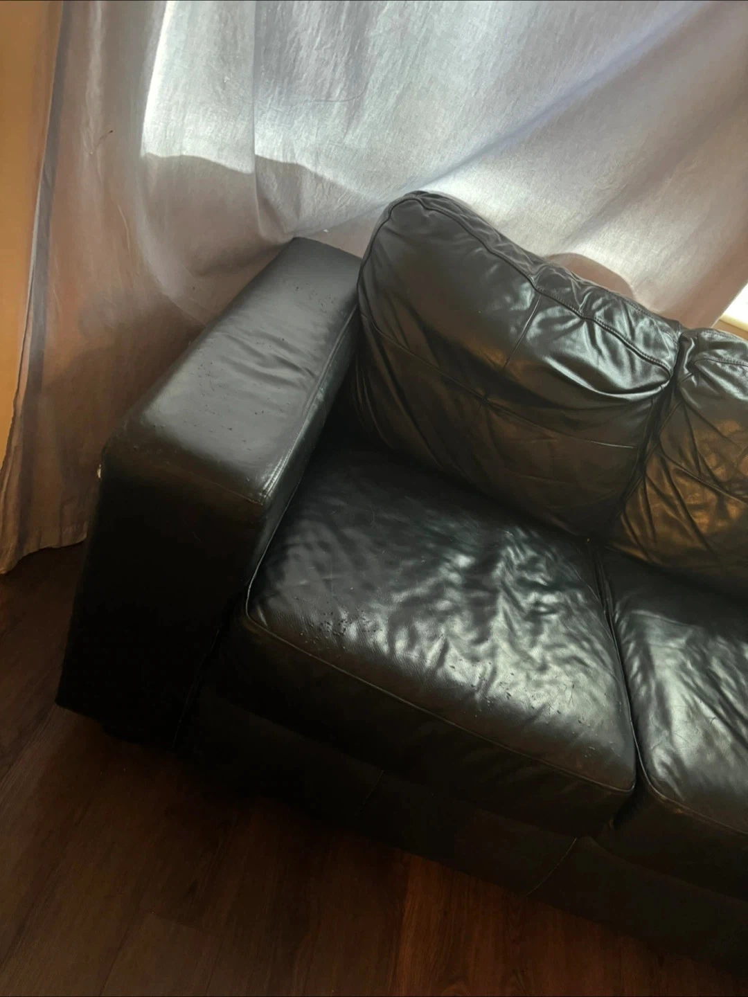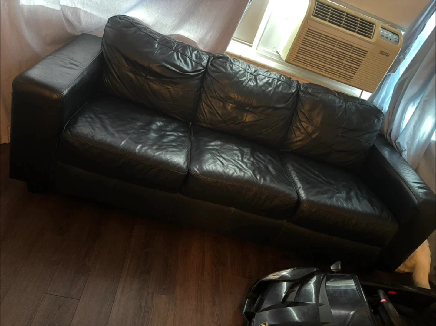 This is a black leather three-seater sofa. It has a classic design with plush cushions for comfort. Some minor wear and tear is visible on the corners and sides, consistent with regular use. It's a solid piece for any living room.
