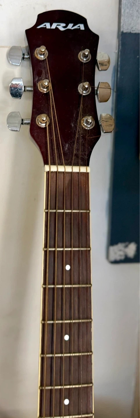 An Aria acoustic guitar, model AW-20 LHN. Handcrafted fine quality guitars since 1956. It features a natural wood finish and a black pickguard. Perfect for beginner musicians looking for a reliable instrument.