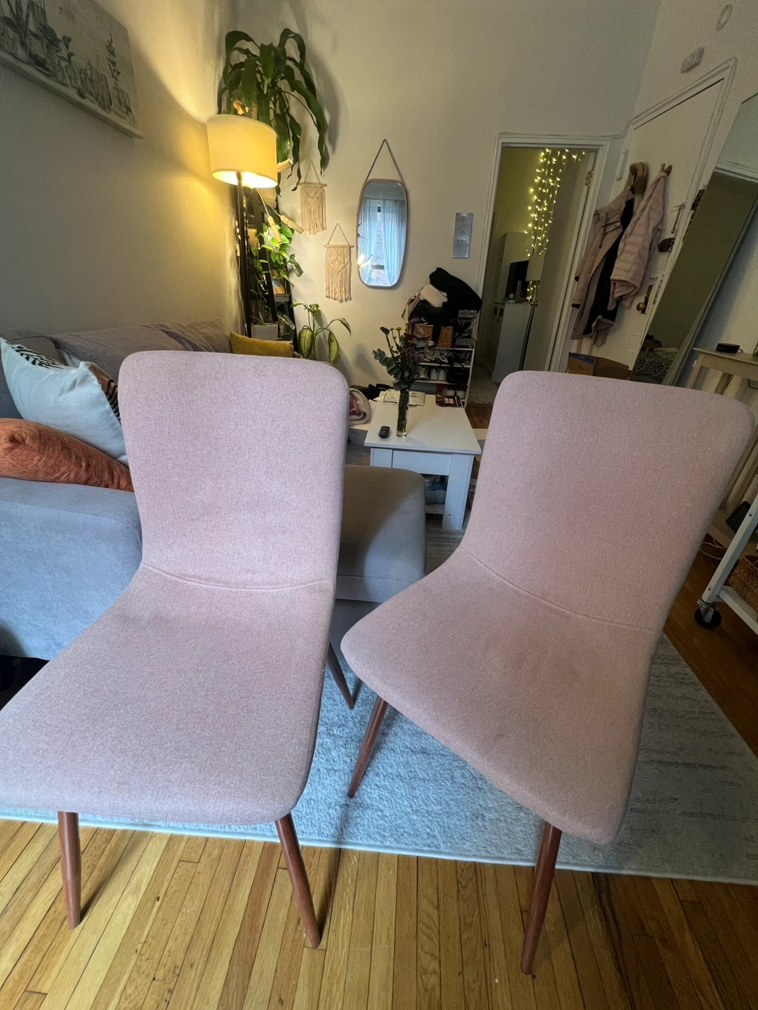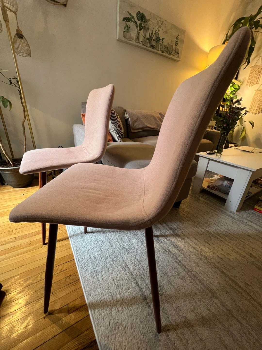 These two accent chairs feature a soft pink fabric upholstery and slender wooden legs. Some marks but no large stains. Fabric upholstery, pet free and clean home. Wooden legs.