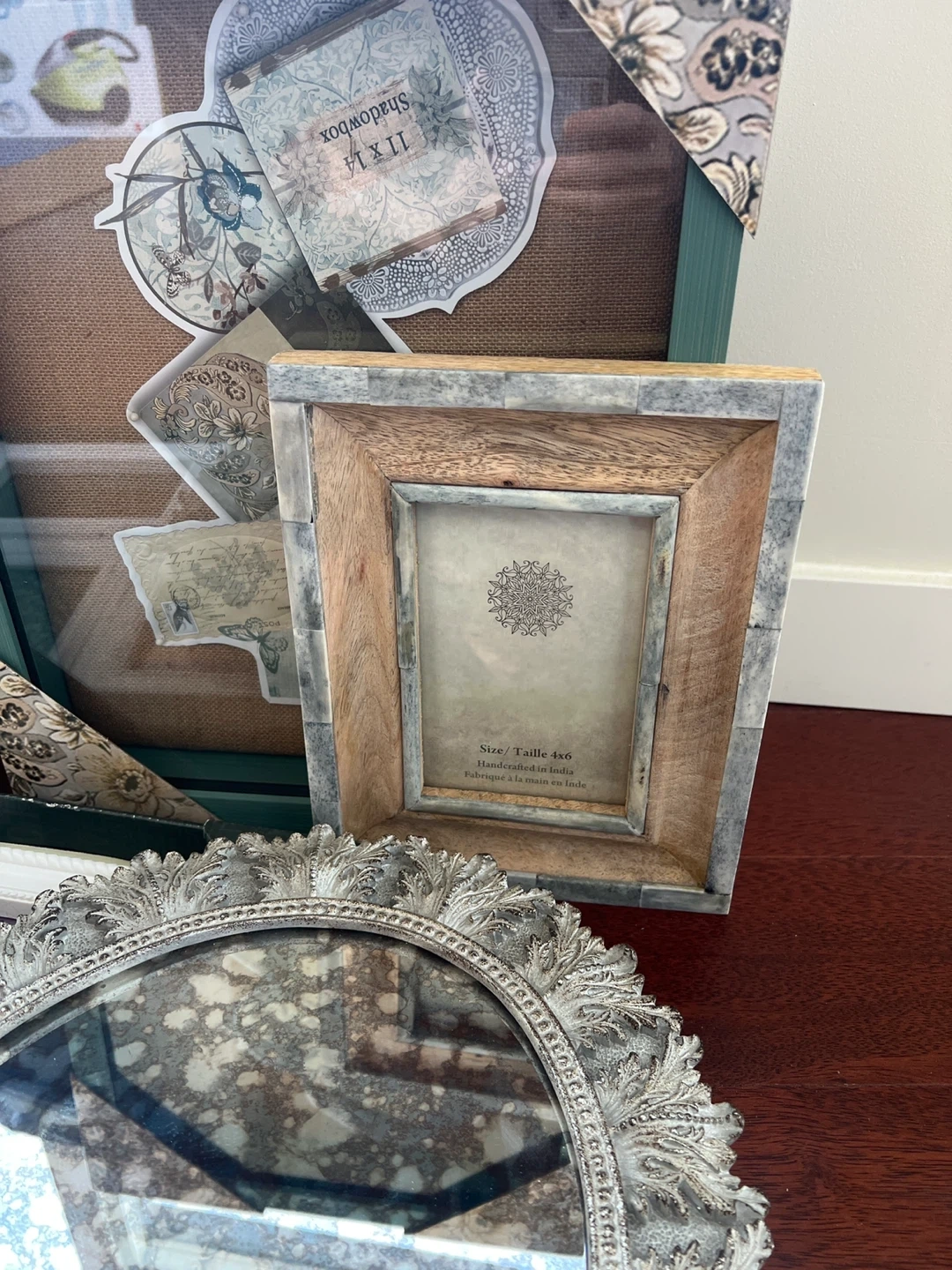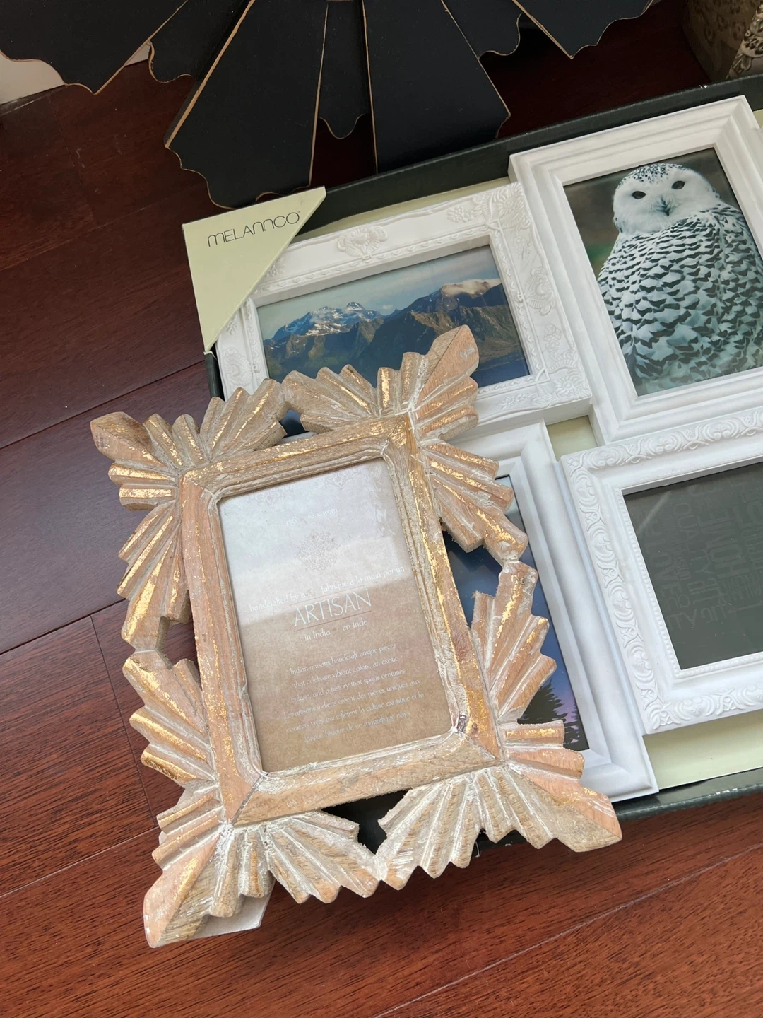 A collection of decorative photo frames and mirrors in various styles. Includes a multi-photo frame from Melamco and a rustic wooden frame. Perfect for adding a personal touch to your home decor. A great way to display cherished memories!