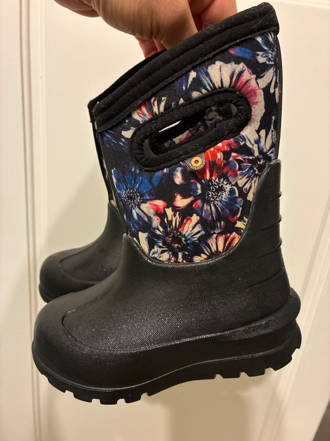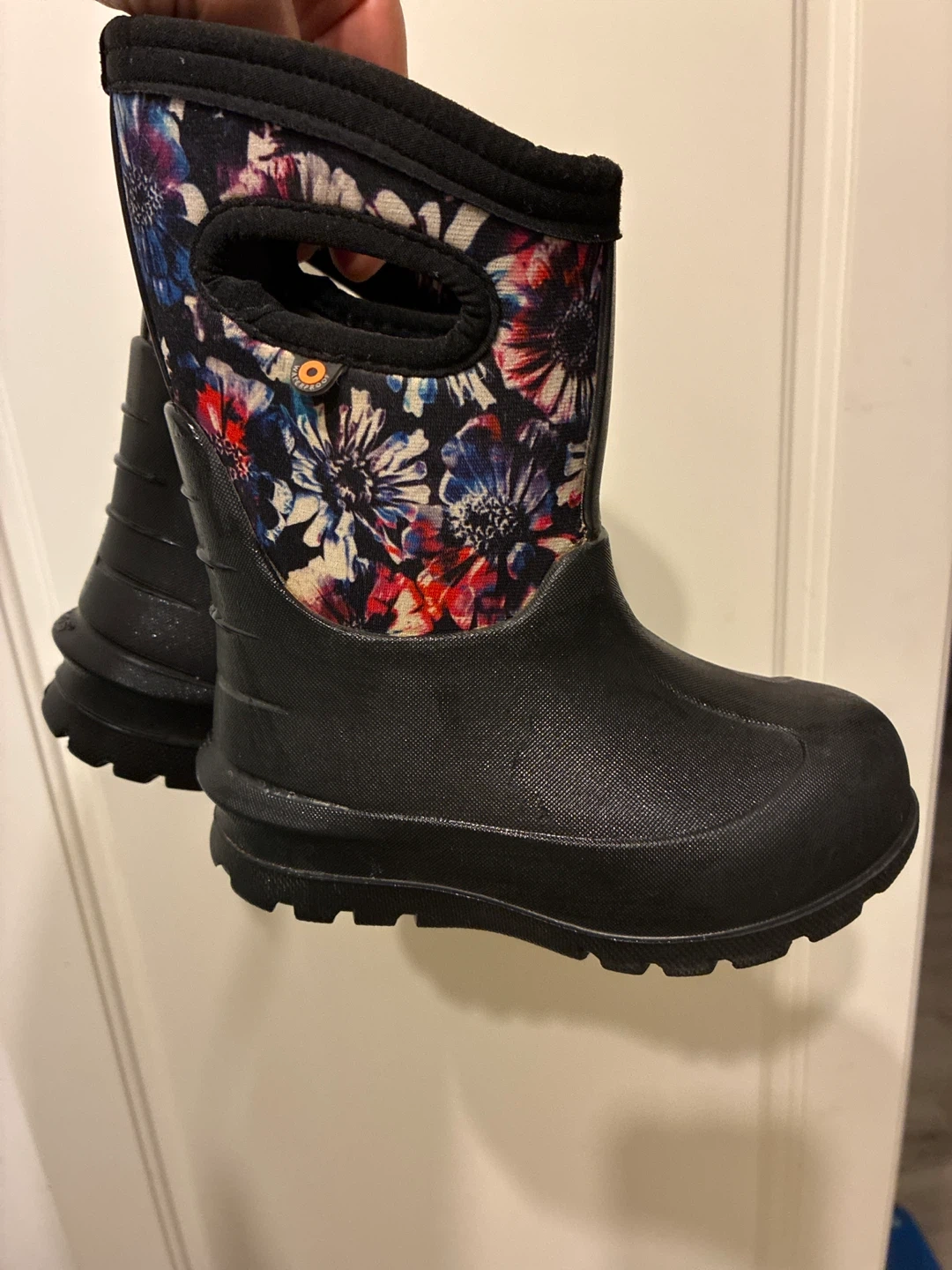 These Bogs kids' boots are perfect for keeping little feet dry and cozy! They feature a fun floral pattern on the upper part of the boot and a durable black waterproof base. Size 7.