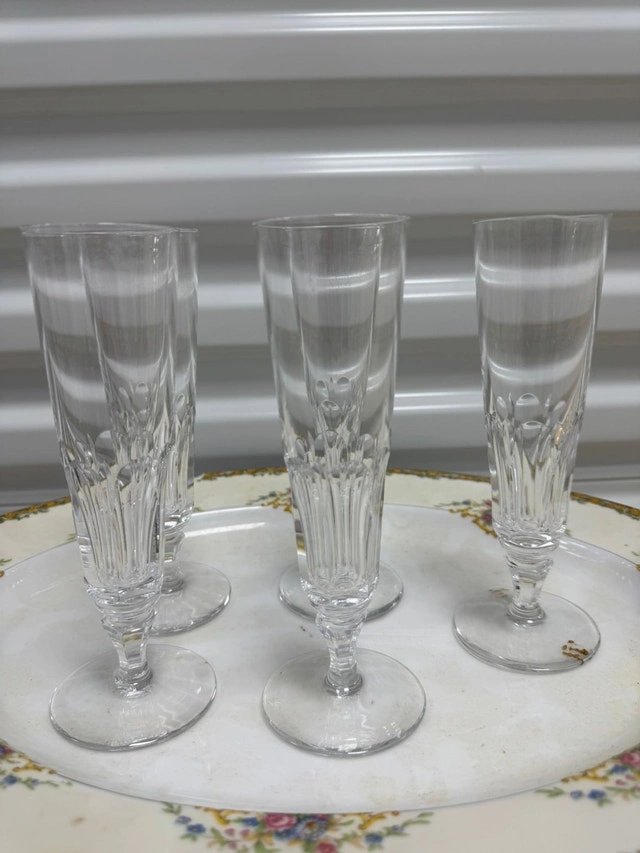 Elevate your celebrations with this elegant set of crystal champagne flutes. These glasses feature a delicate, stemmed design and a brilliant clarity that showcases the effervescence of your favourite bubbly. These are used glasses. Perfect for adding a touch of sophistication to any occasion. Own this beautiful set today for just $40. If the ad is up, they're still available!