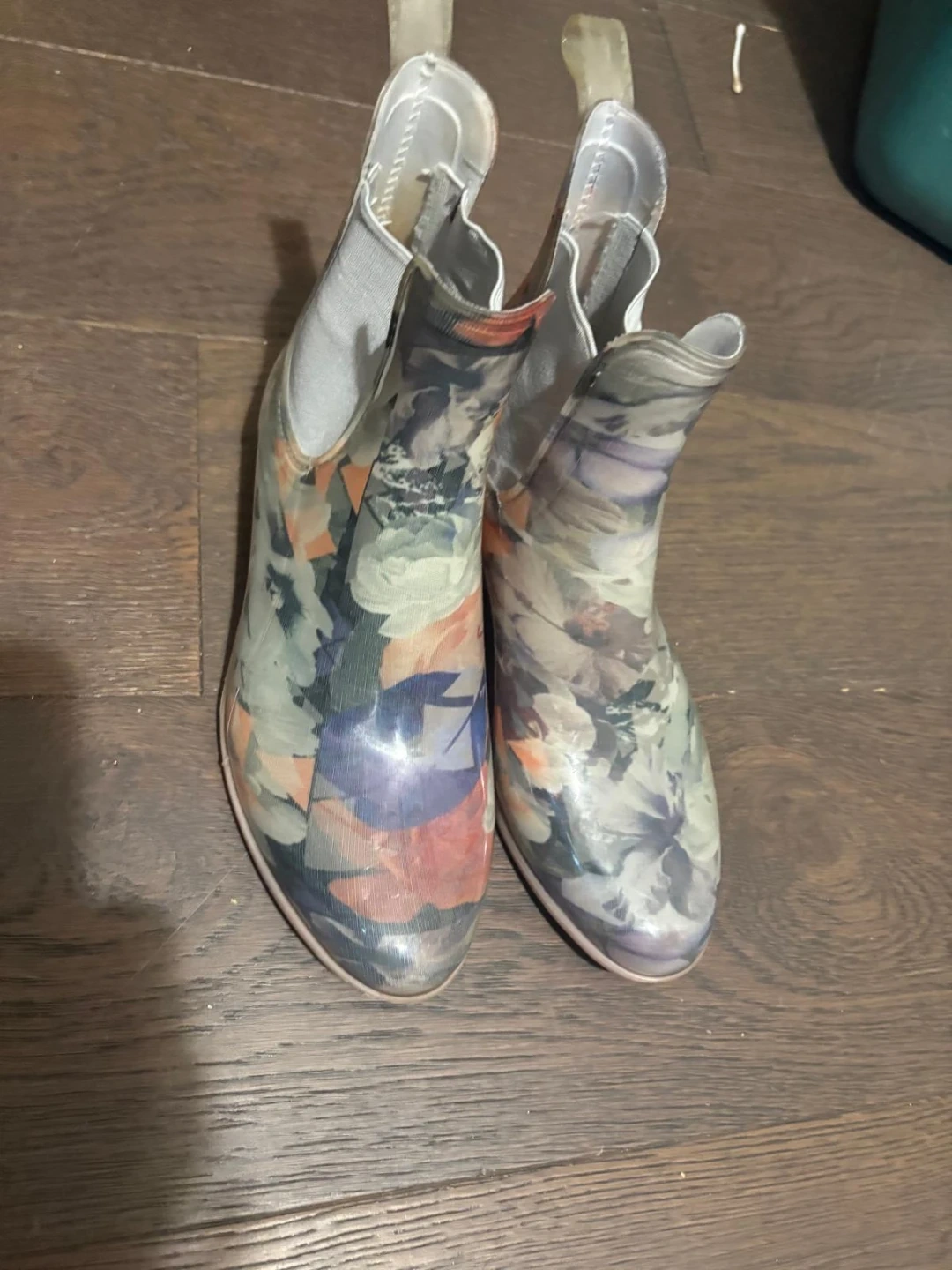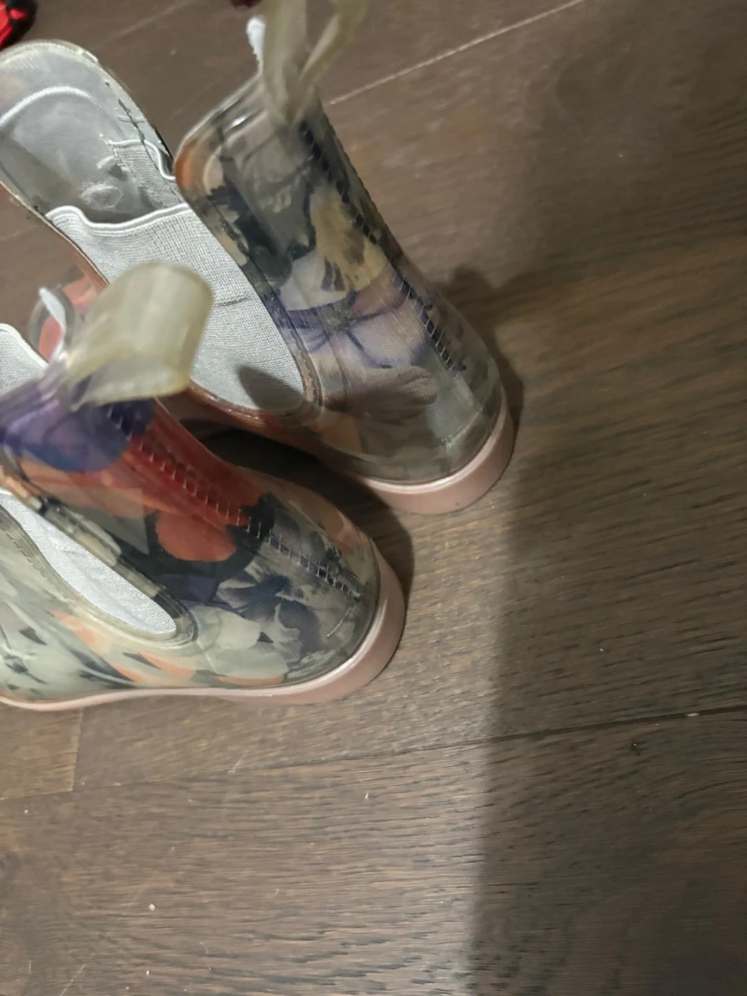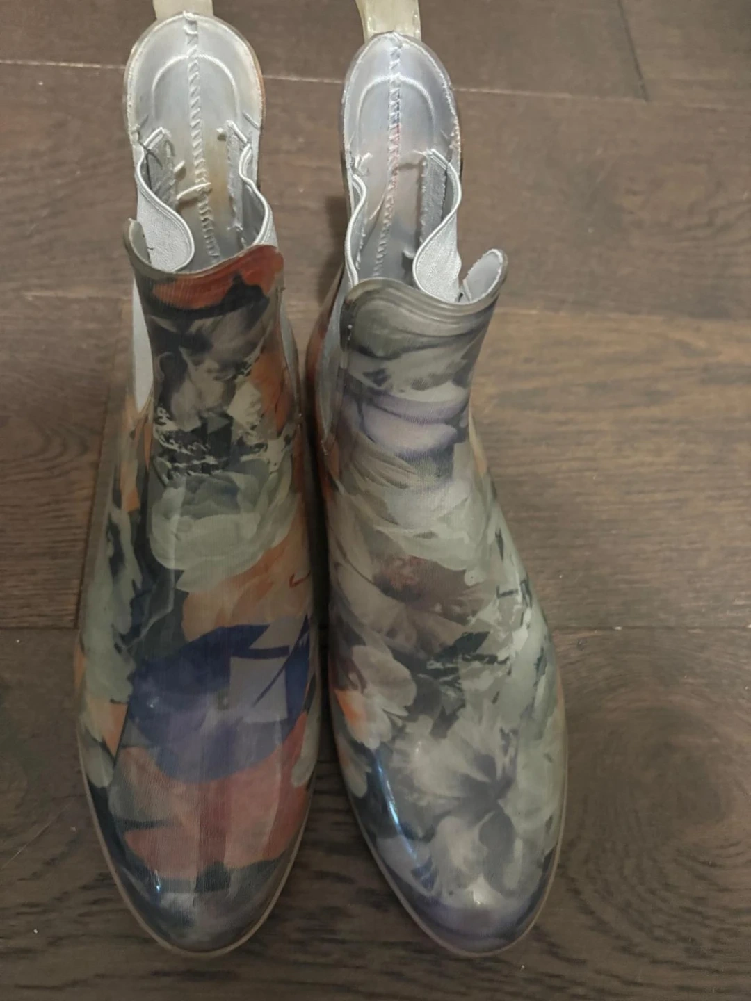 These transparent rain boots feature a colourful floral pattern. They're made of rubber and have elastic side panels for an easy slip-on style. Perfect for keeping your feet dry on a rainy day!