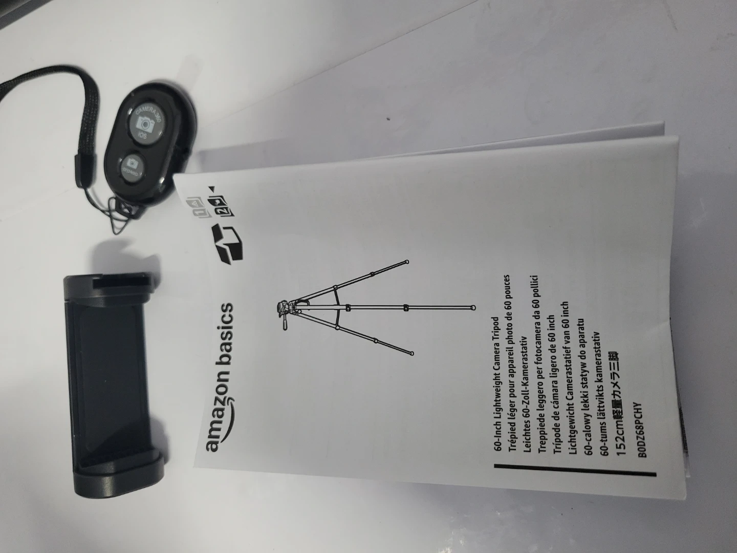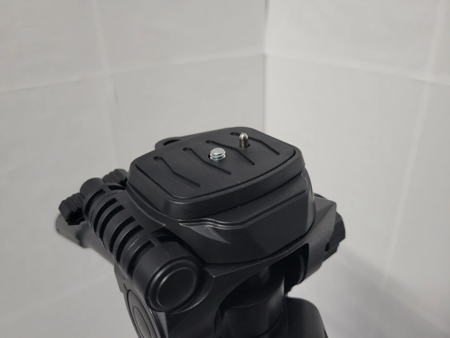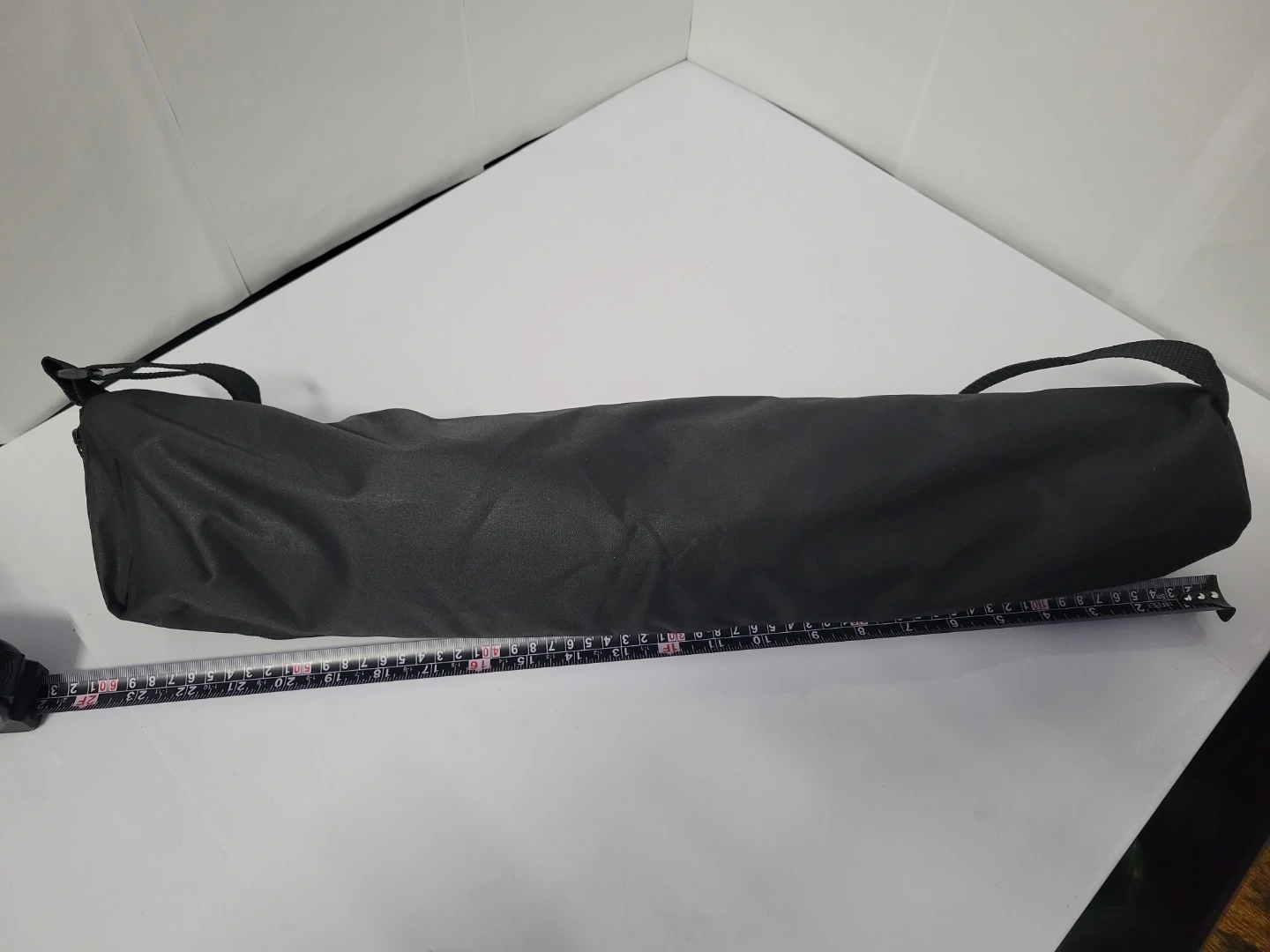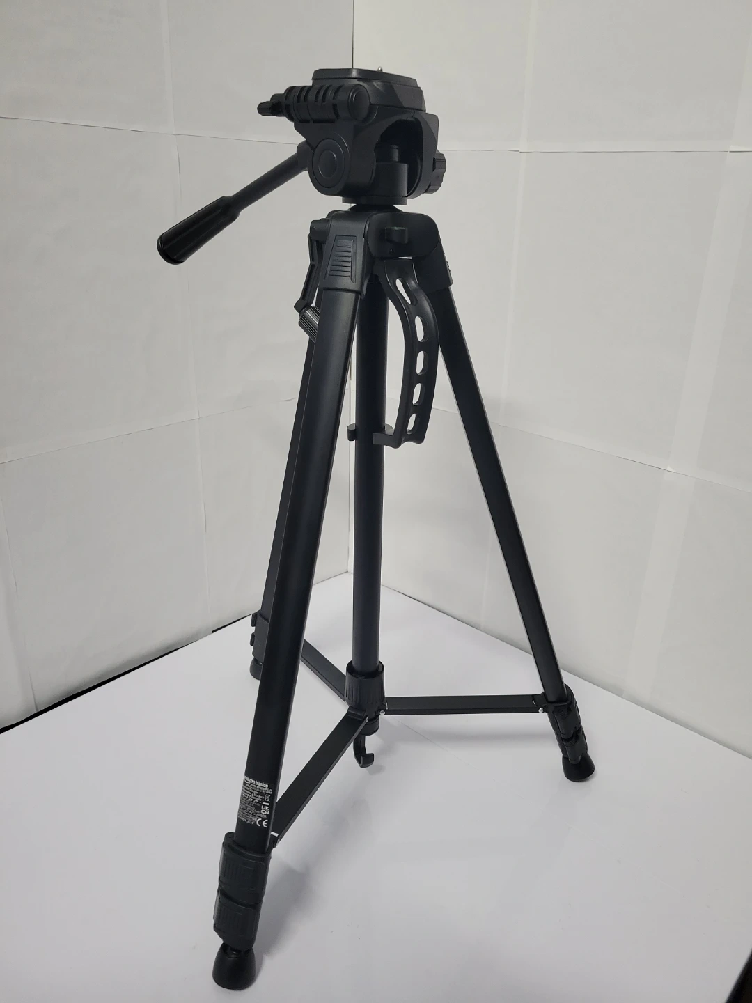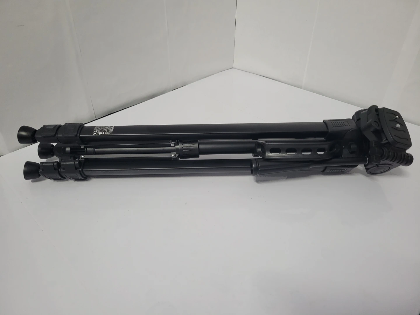 This is a black camera tripod, new never used. It's made of aluminum and plastic. It includes a carrying bag for transport. Tripods offer stable camera support.