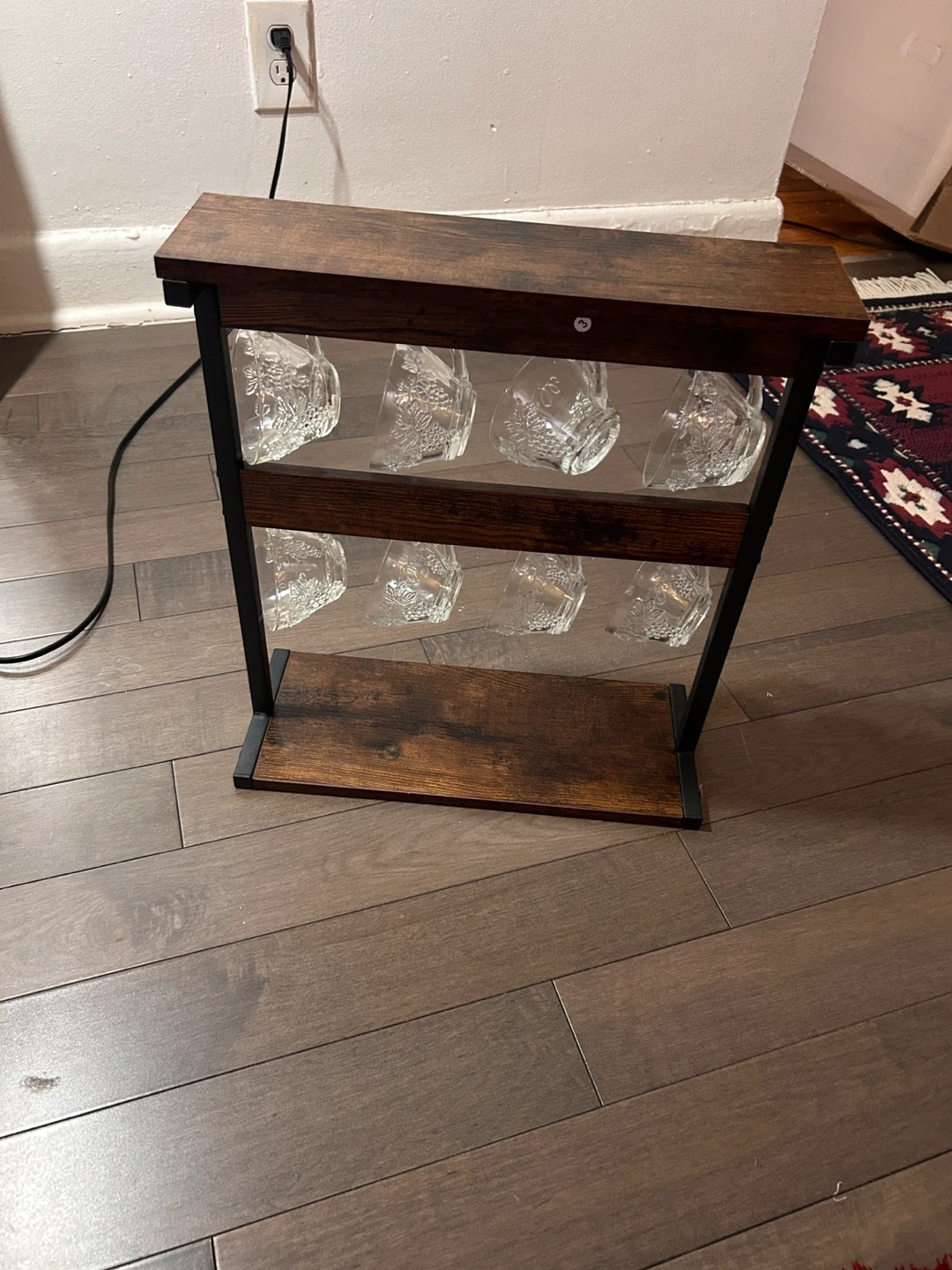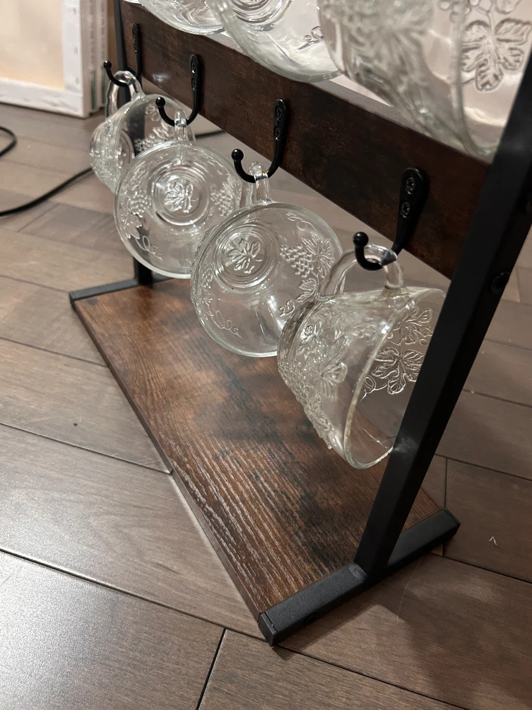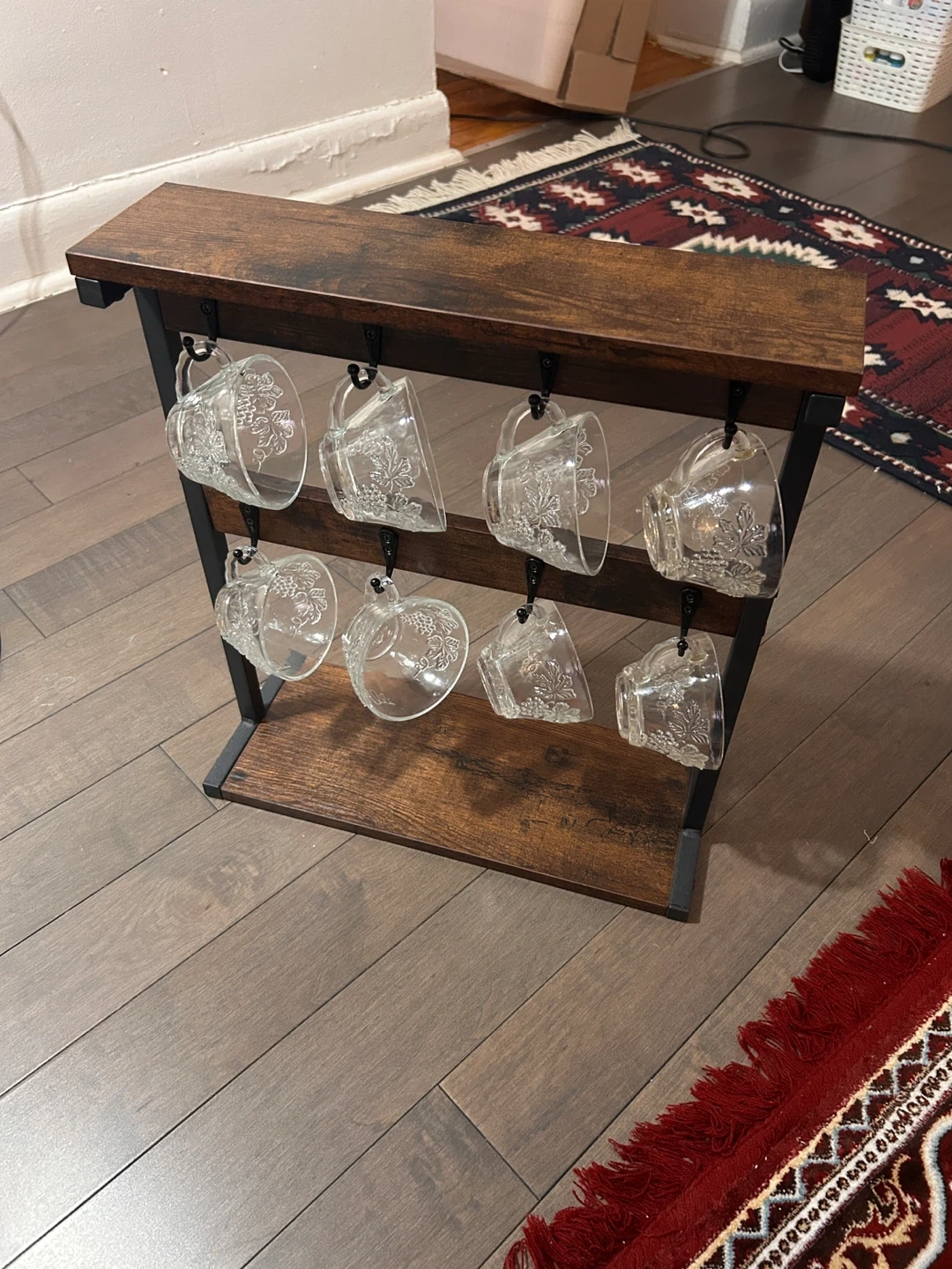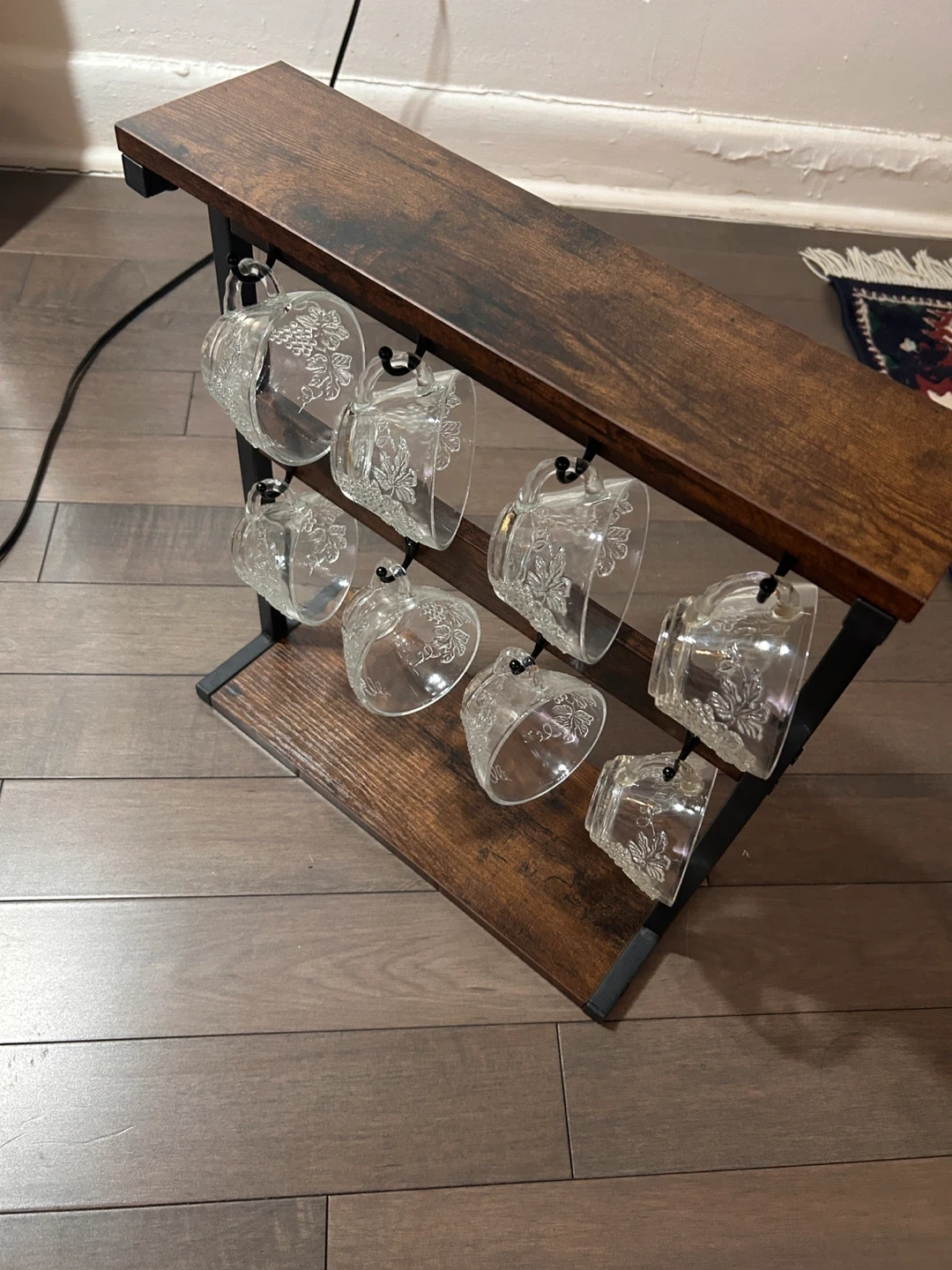 A freestanding mug holder with a rustic wood top shelf and base, and black metal frame. It's designed to hold up to 8 mugs or cups, keeping them organized and accessible. Great for coffee stations or display shelves!
