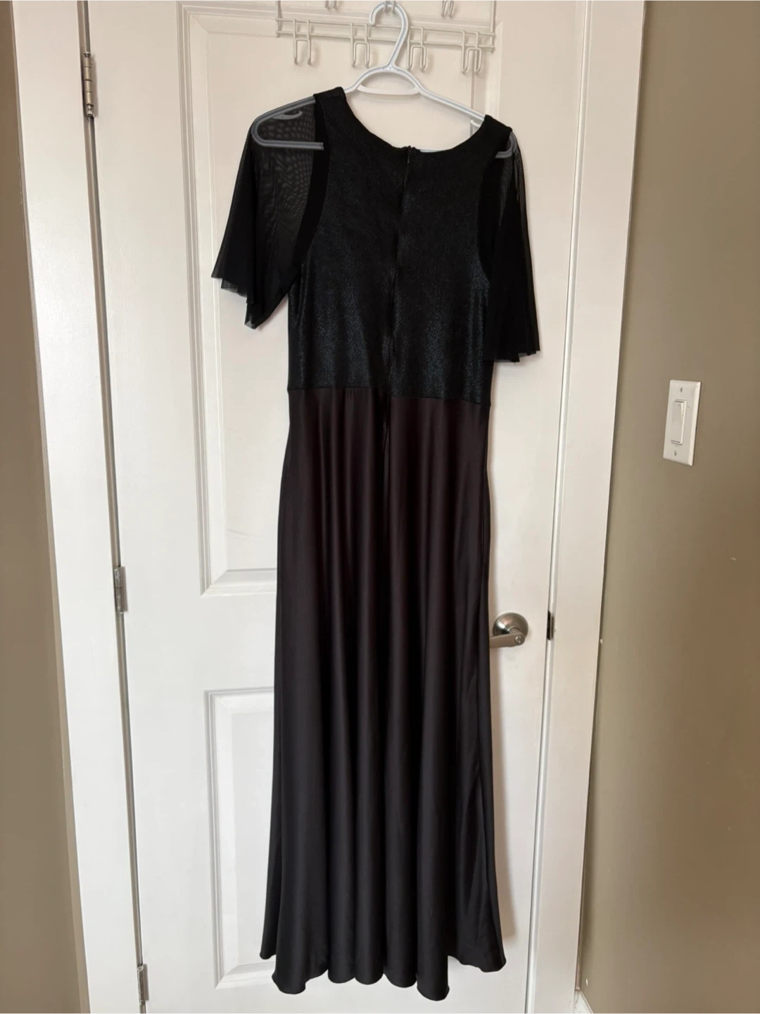 Elegant black maxi dress with sheer mesh short sleeves and a sparkling bodice. The dress has a V-neckline and a flattering A-line skirt. It's perfect for formal events or a night out!