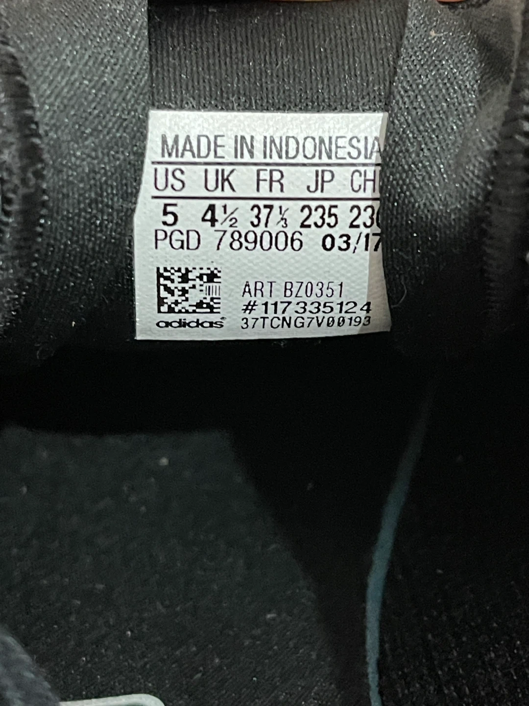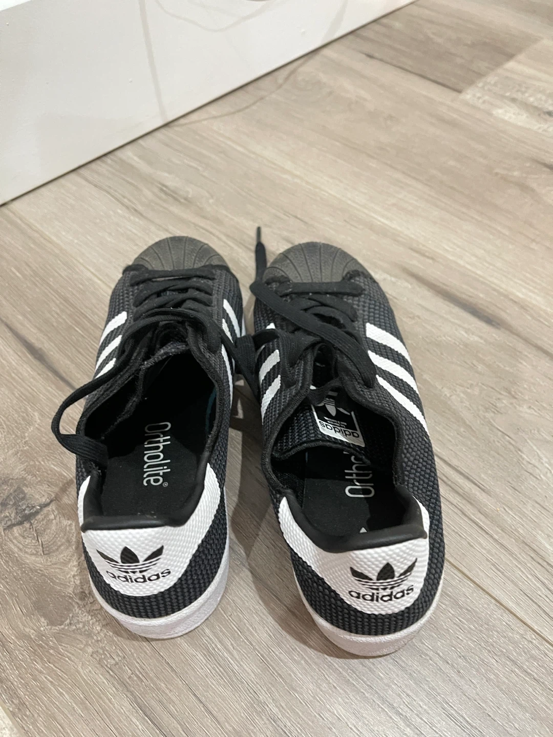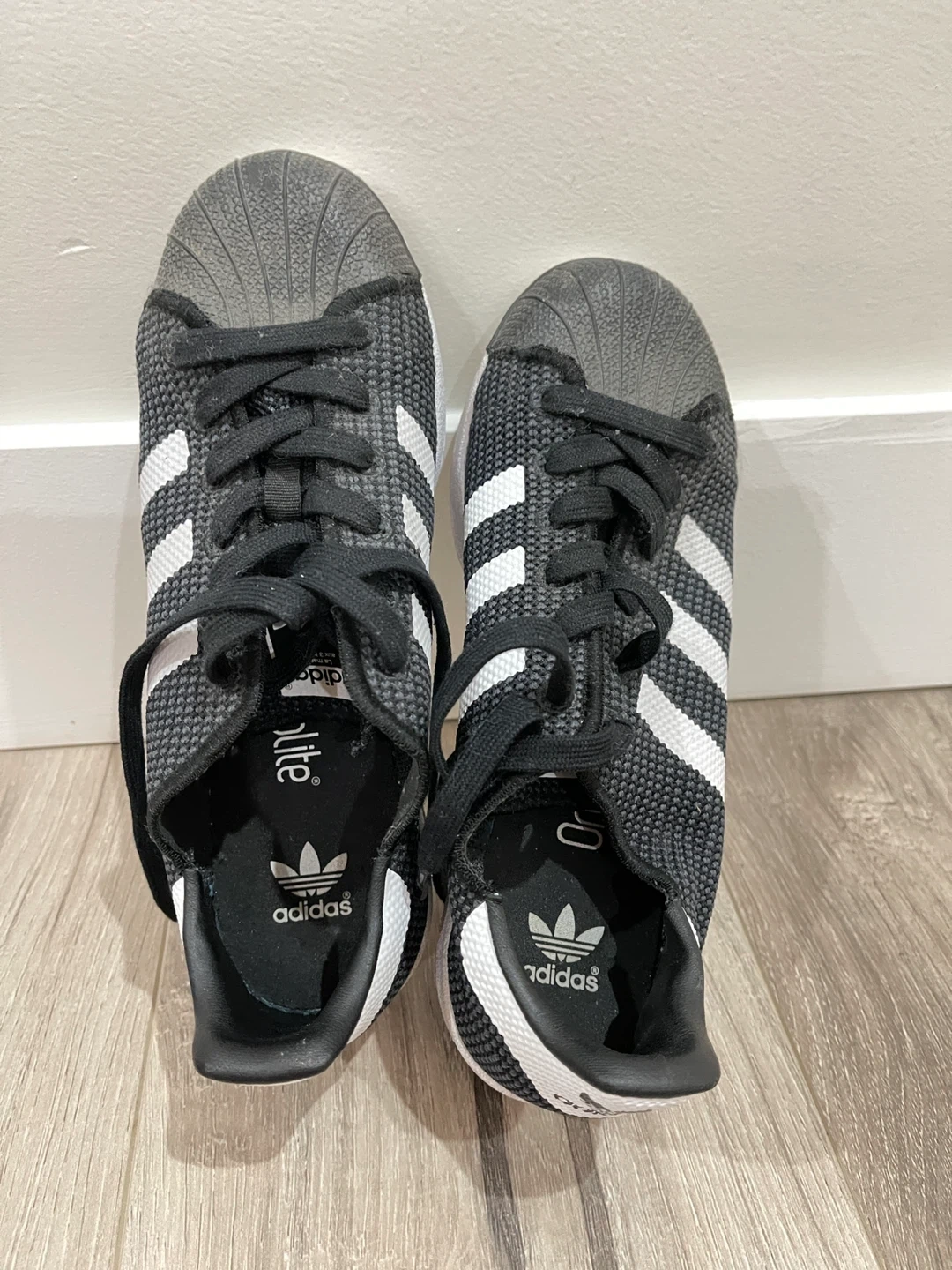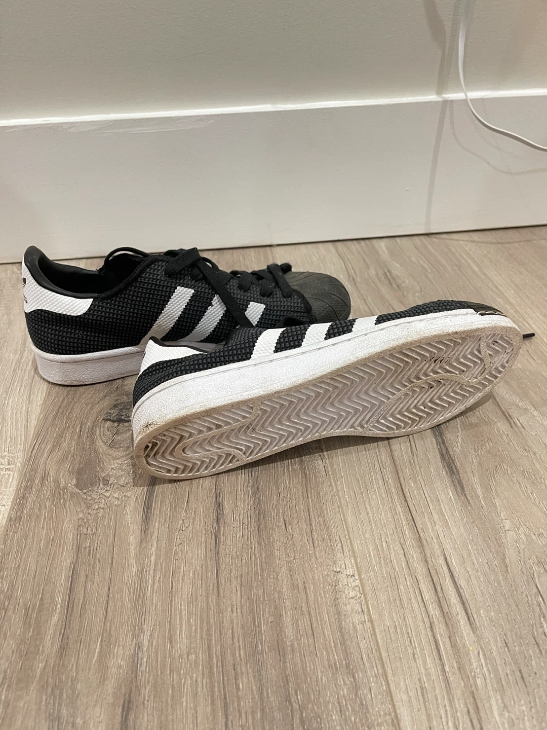 These are a pair of black and white Adidas Superstar sneakers. They feature the classic three stripes and a rubber shell toe. Made in Indonesia. Kid size 5, fit Women size 7. Wore handful of time still have lots of life left.