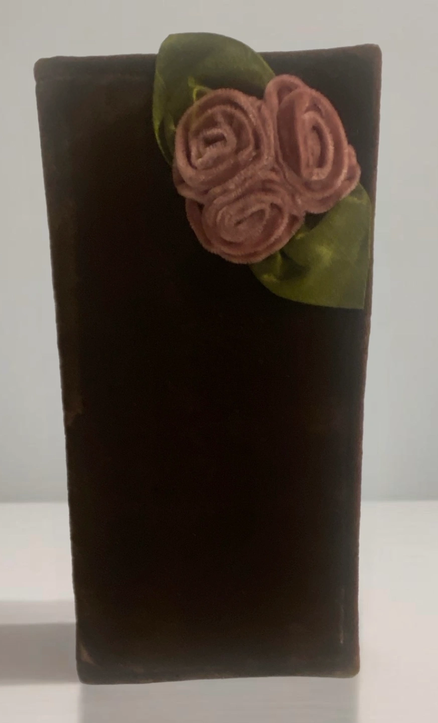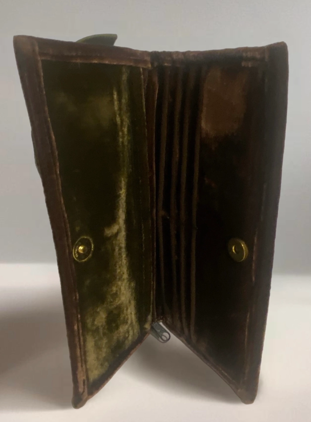 Dark brown velvet wallet. Features a decorative rose embellishment. Interior is lined in olive green velvet. Multiple card slots and two zippered compartments .