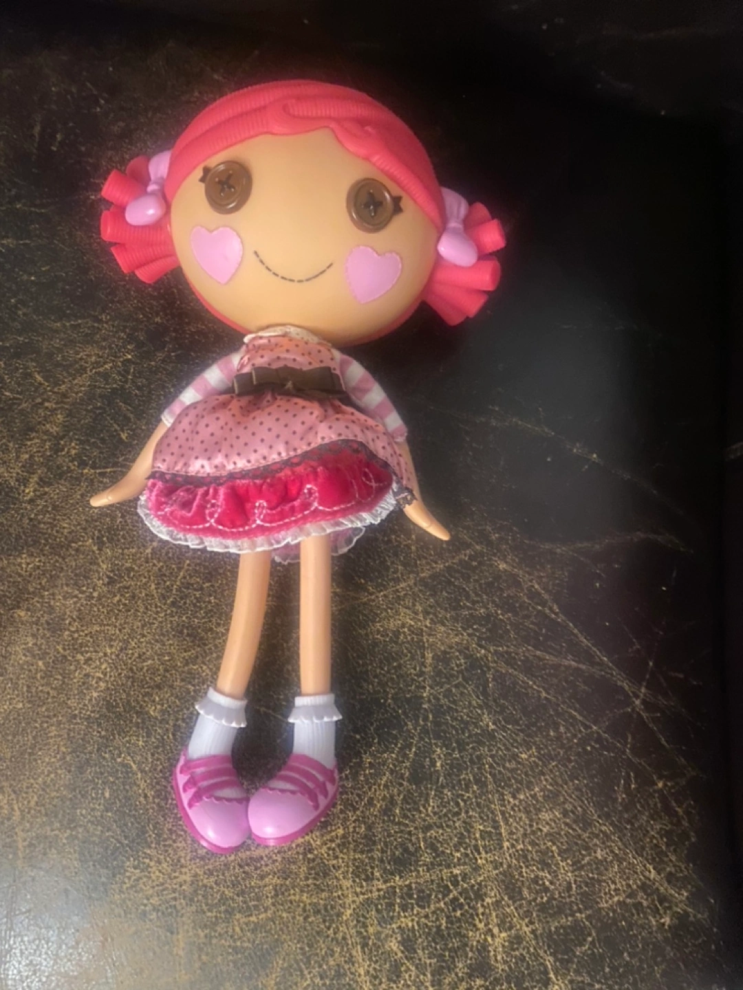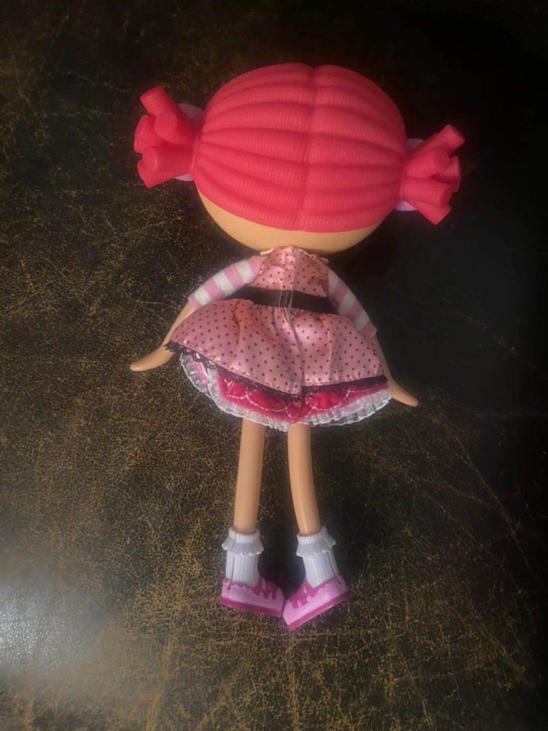 Three Lalaloopsy toys. Includes a doll with pink hair and dress, a rocking horse, and a little Lalaloopsy cat toy like new $25