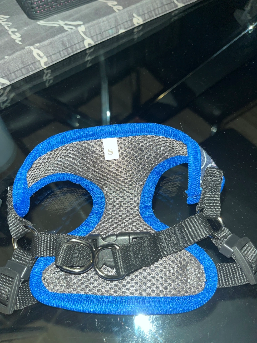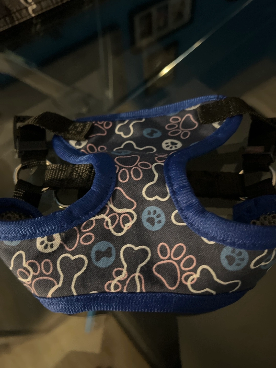 Small dog harness, blue and grey paw print design. Adjustable straps. Size small. Lightly used to try on a new puppy but never used for anything else smoke free home