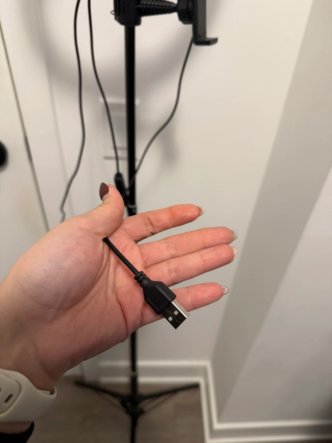 Adjustable ring light on a tripod stand. Includes phone holder. Features brightness and colour temperature controls. USB powered. Stand from 11.8” to 67”.