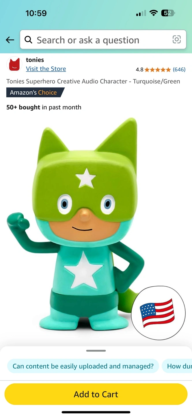 18Adorable collectible Tonie figure. Green and turquoise superhero design. Pairs with Toniebox. Hours of stories, songs, and sounds.