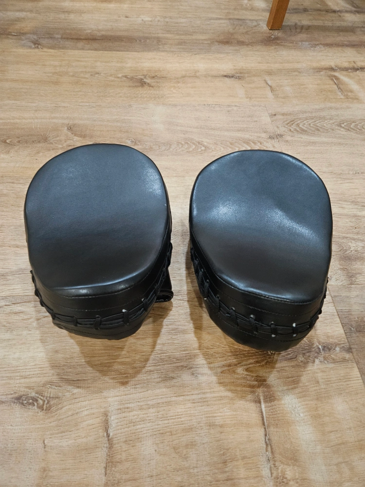 Pair of black leather focus mitts. Great for boxing training. Durable construction. Suitable for various martial arts. BRAND NEW NEVER USED