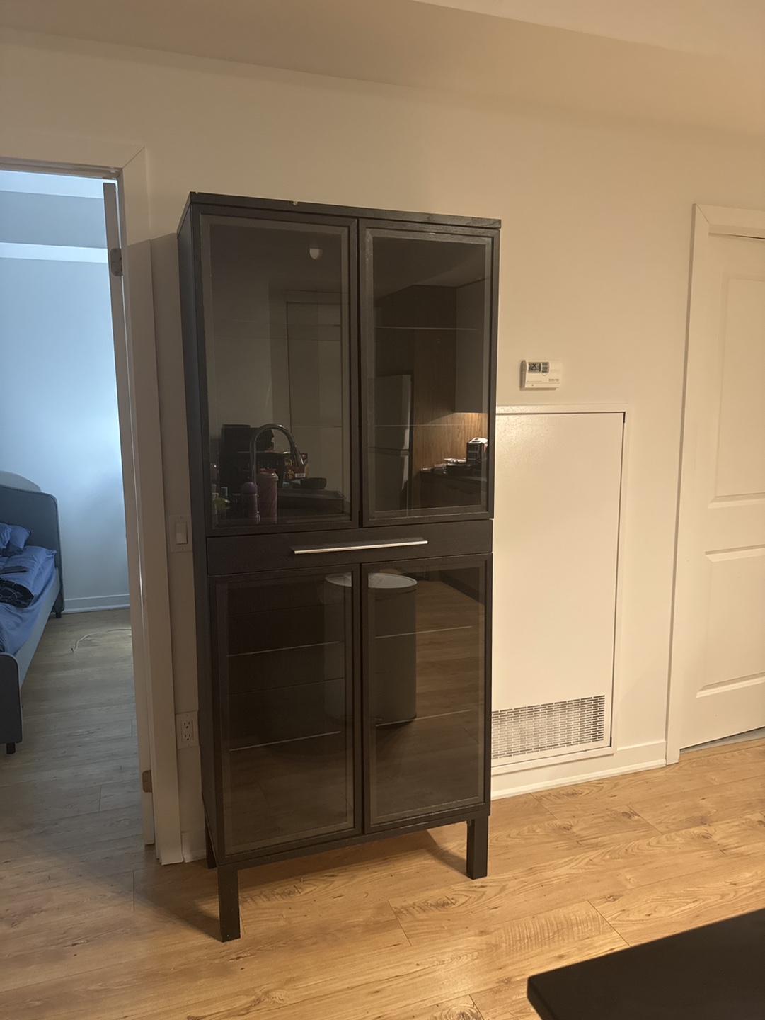Tall dark brown cabinet with glass doors and shelves. Four doors, two on top and two on bottom. Good for storage and display. Minimalist design. Pickup only