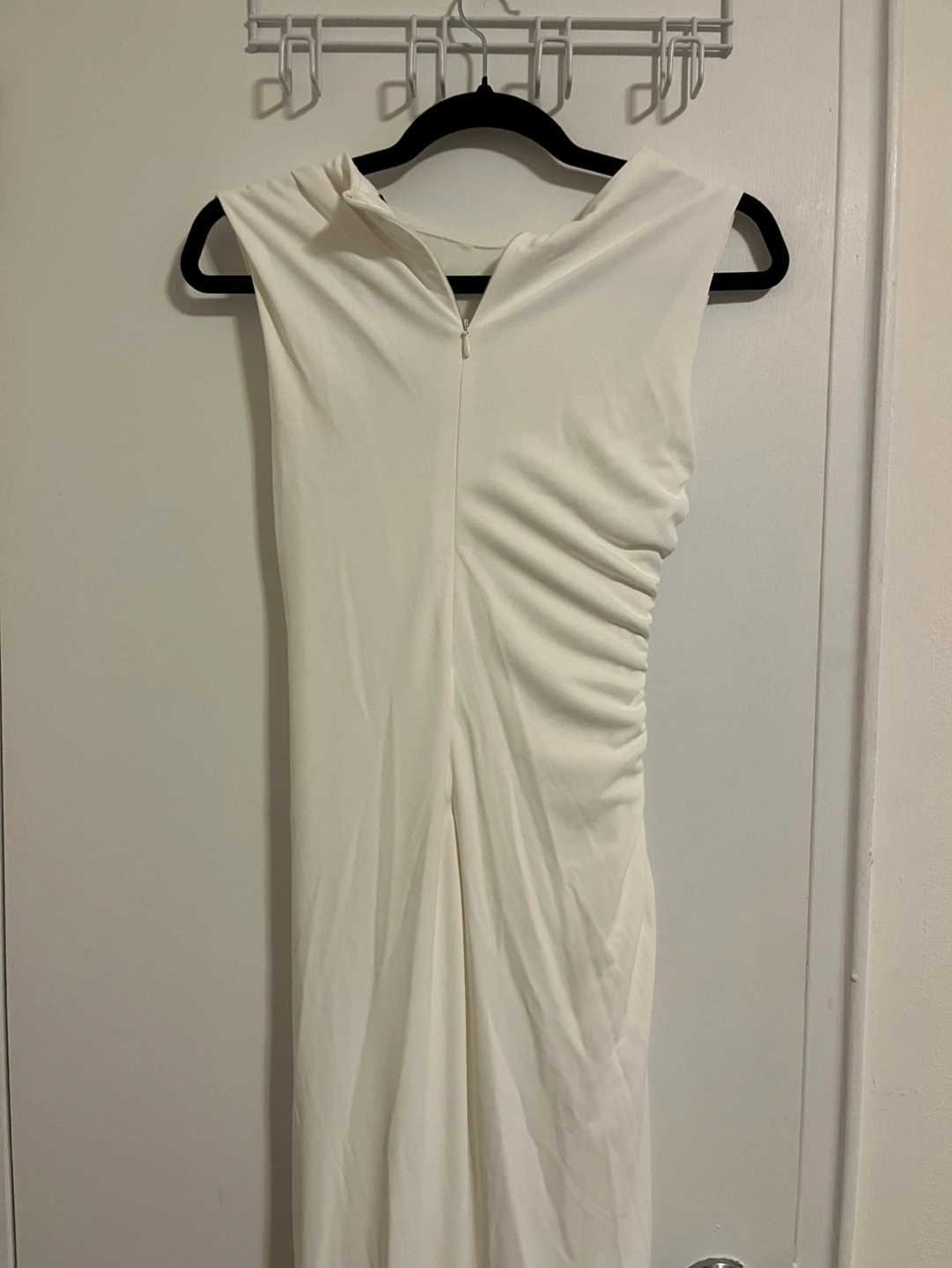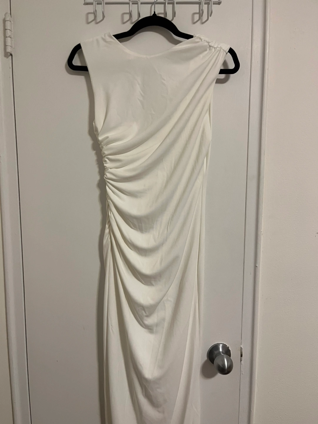 Elegant white midi dress. Features ruched detailing and a sleeveless design. Back zipper closure. It says size Medium but fits small/extra small