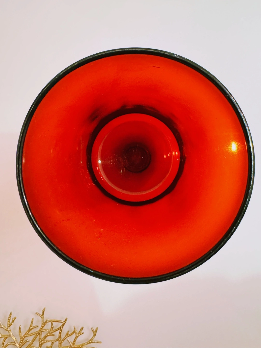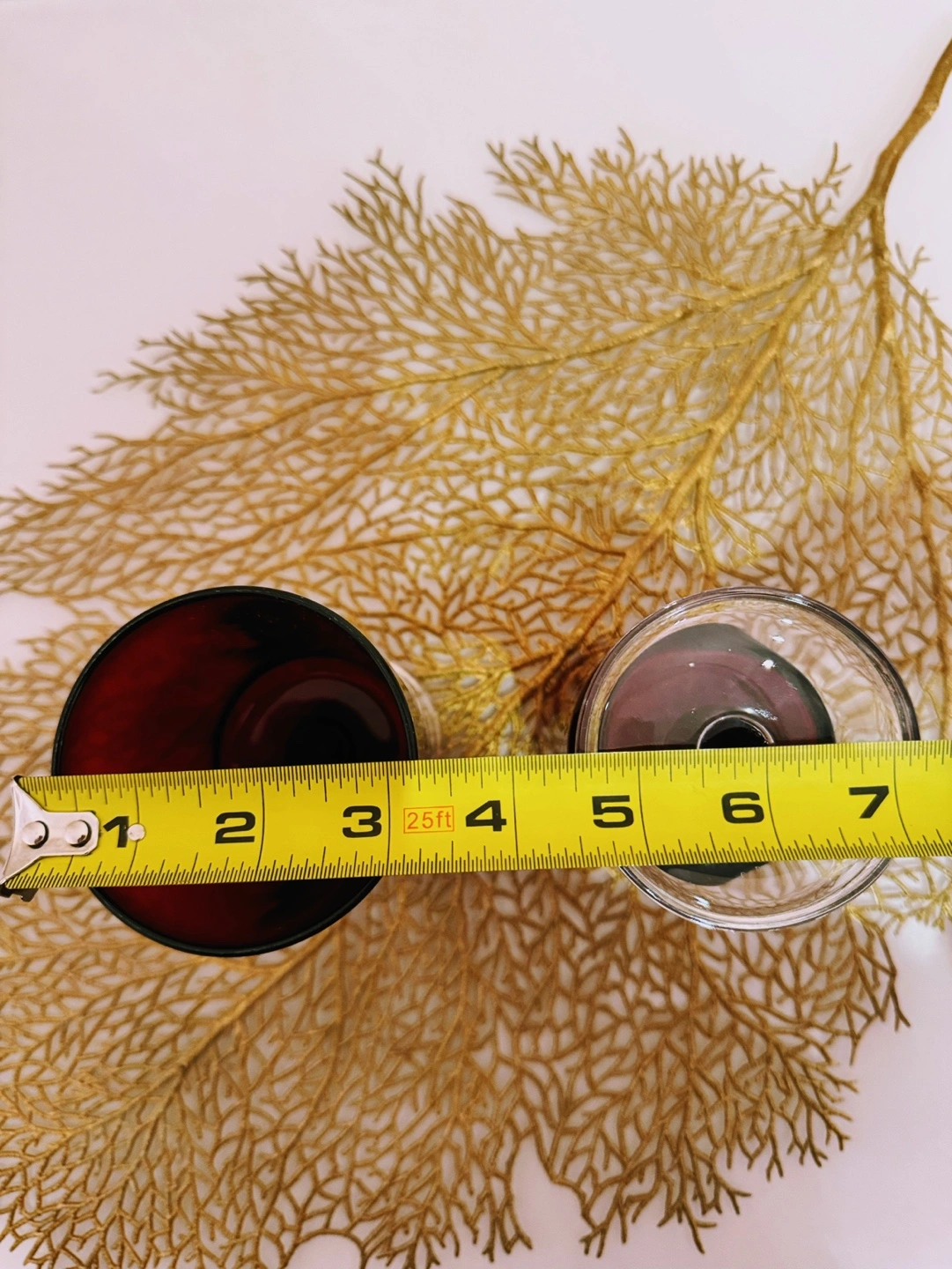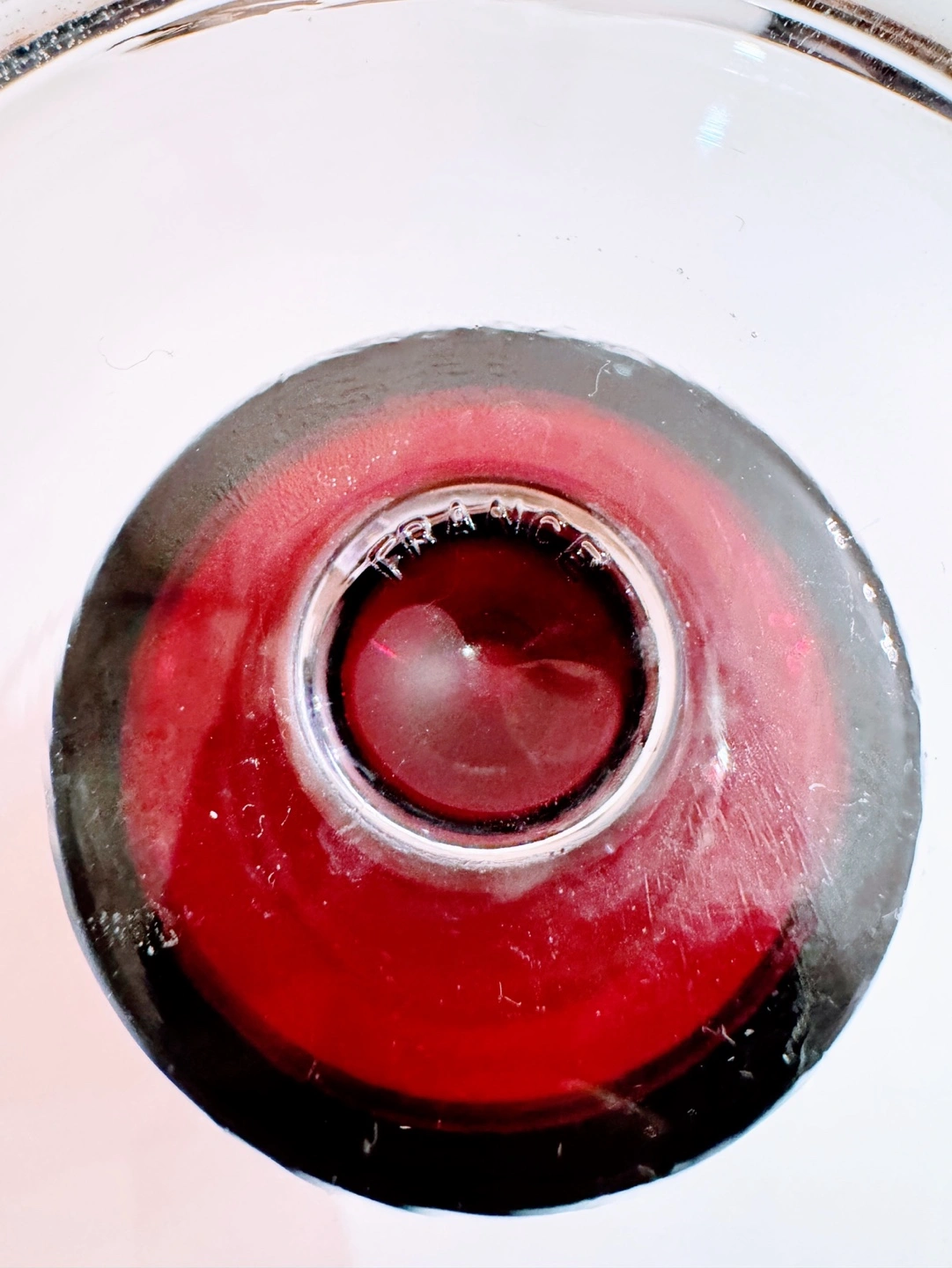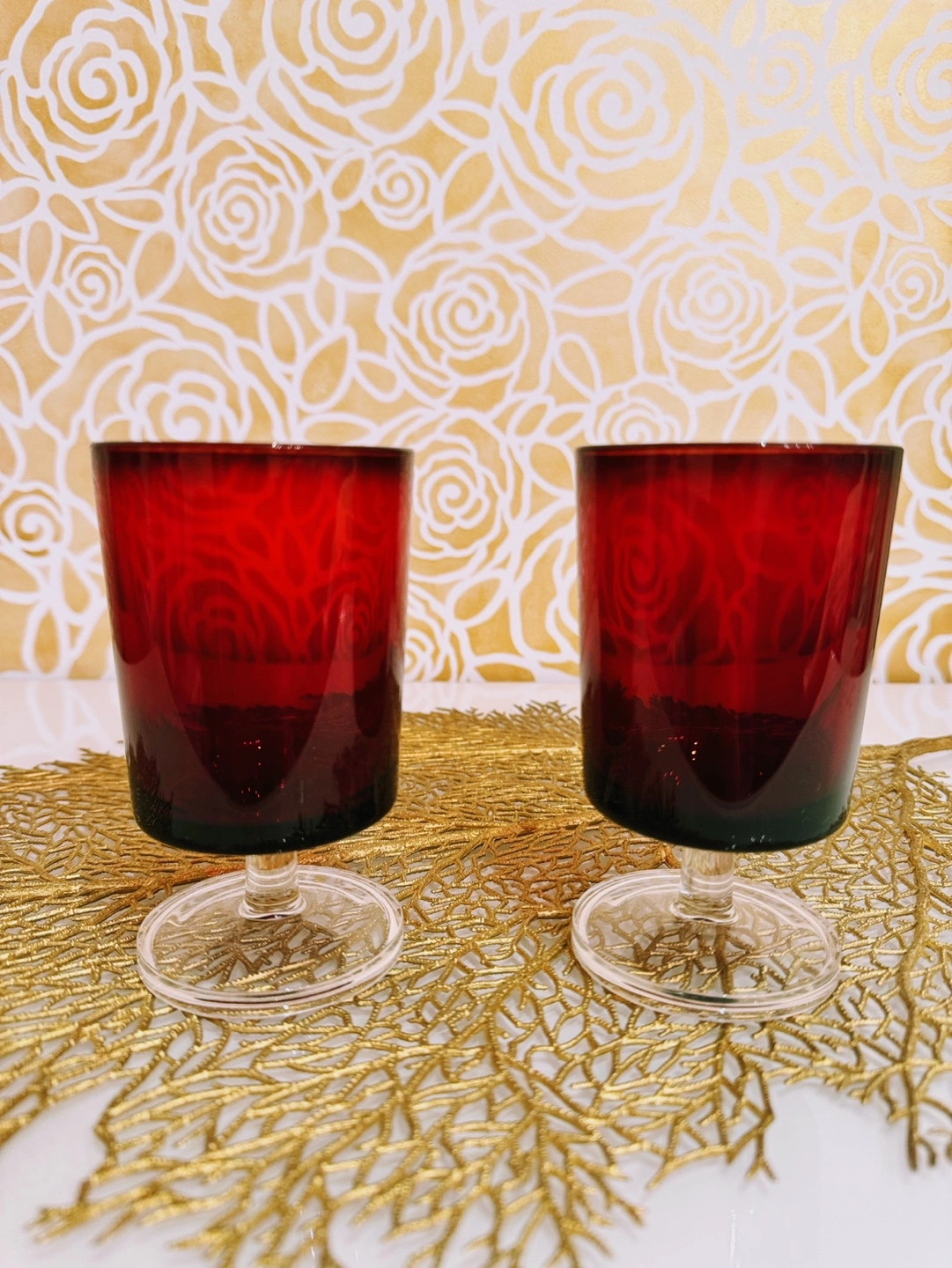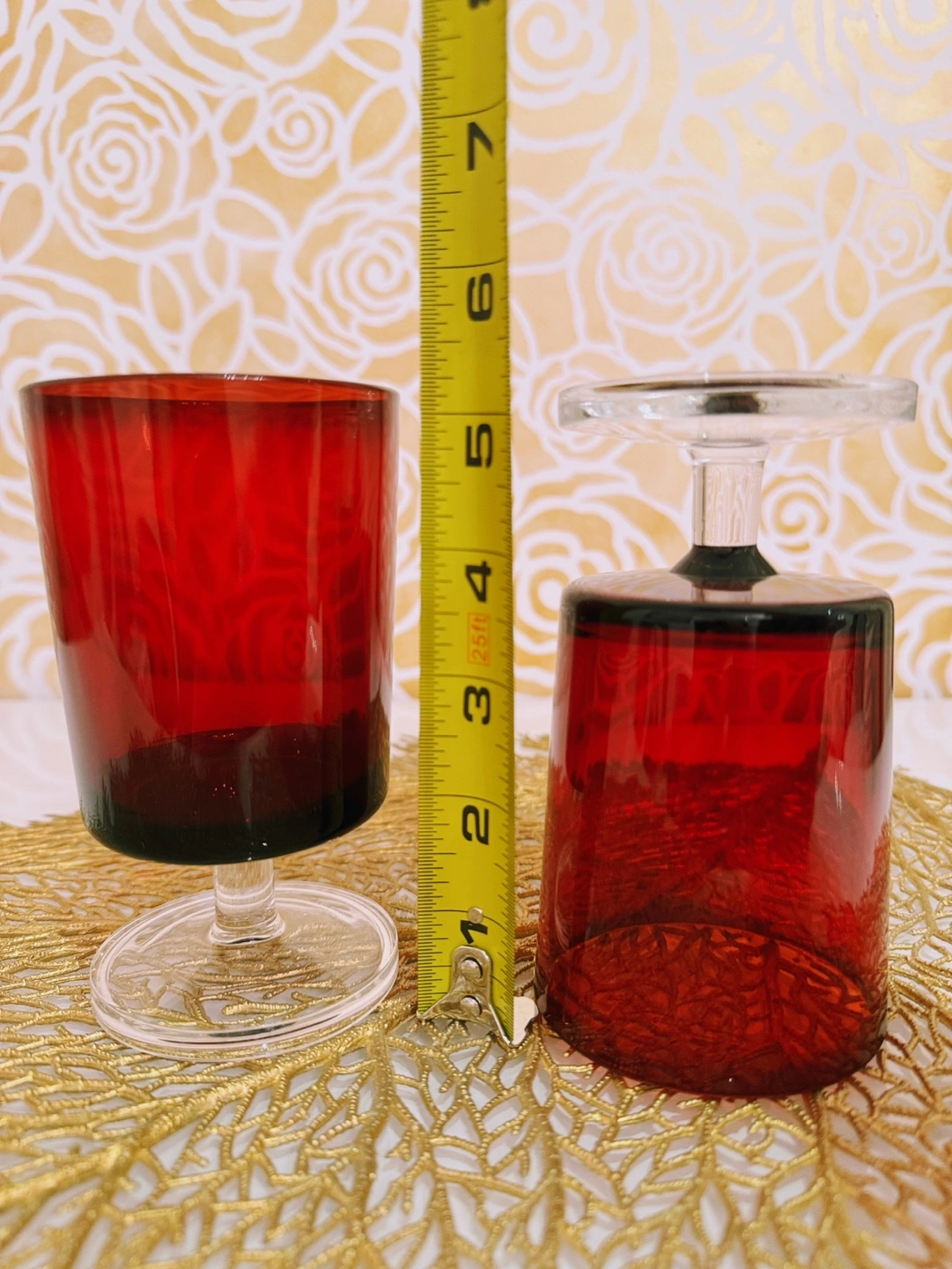 56Crystal d' Arques Mid-Century 1960s rasberry / ruby luminarc cavalier glasses, stamped "France" at the bottom. These will be a great display on your dining table. The cups are about 5-1/4” tall and are about 3" in rim diameter. Each can hold 8 oz liquid fluid. Excellent vintage condition with no chips and cracks. $15 for a set of 2, 4 sets available Please see pictures for details and dimensions.
