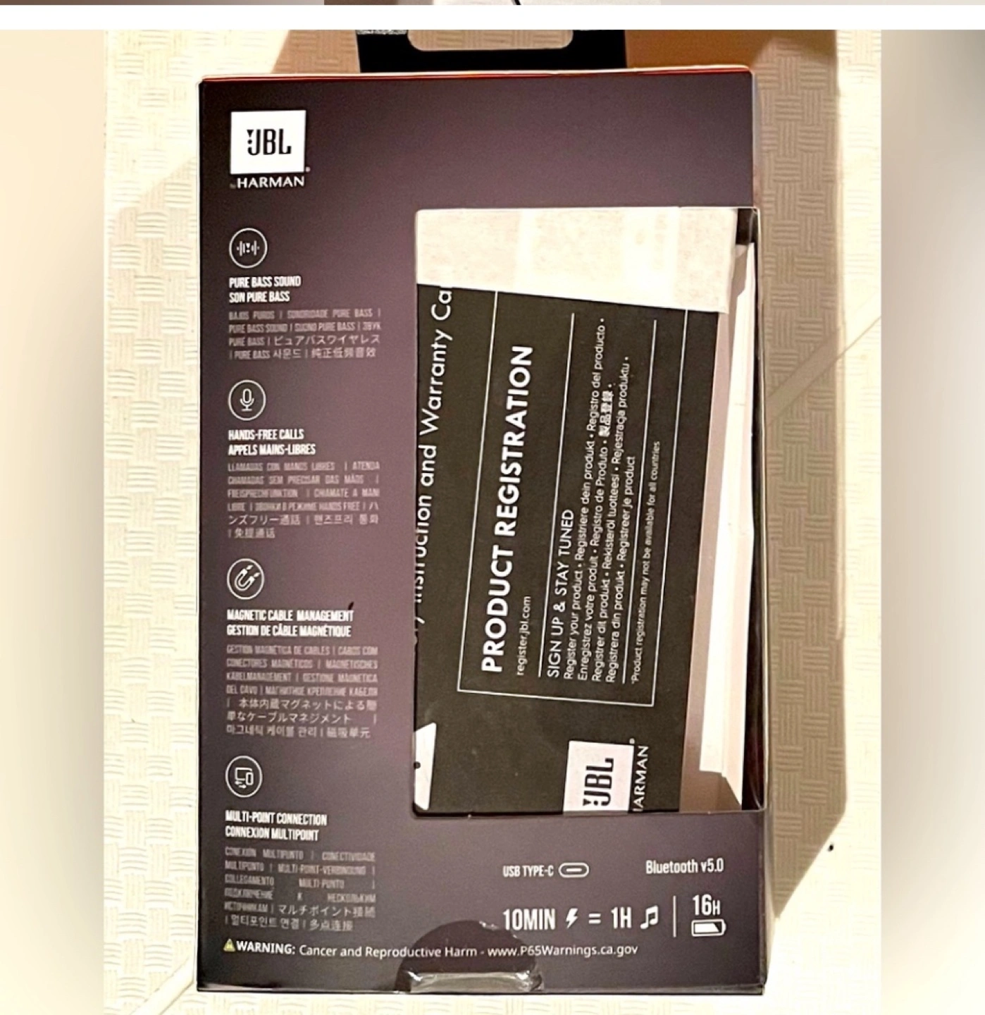 JBL Tune 125BT wireless earbuds. Pure Bass sound. Hands-free calls. Bluetooth 5.0. 16 hours of playtime. Includes USB-C charging cable. Magnet cable management. BRAND NEW - Opened and tested once - I am selling this because I want to continue with my non-wireless headphones.