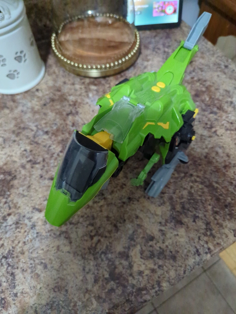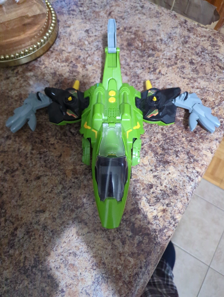 140Green transforming dinosaur toy. Features moving parts and cockpit. Looks like a helicopter in one mode. Suitable for children.Asking $12. Smoke free home. Cash or etransfer. Pick up in Oakville. Please check out my other listings.