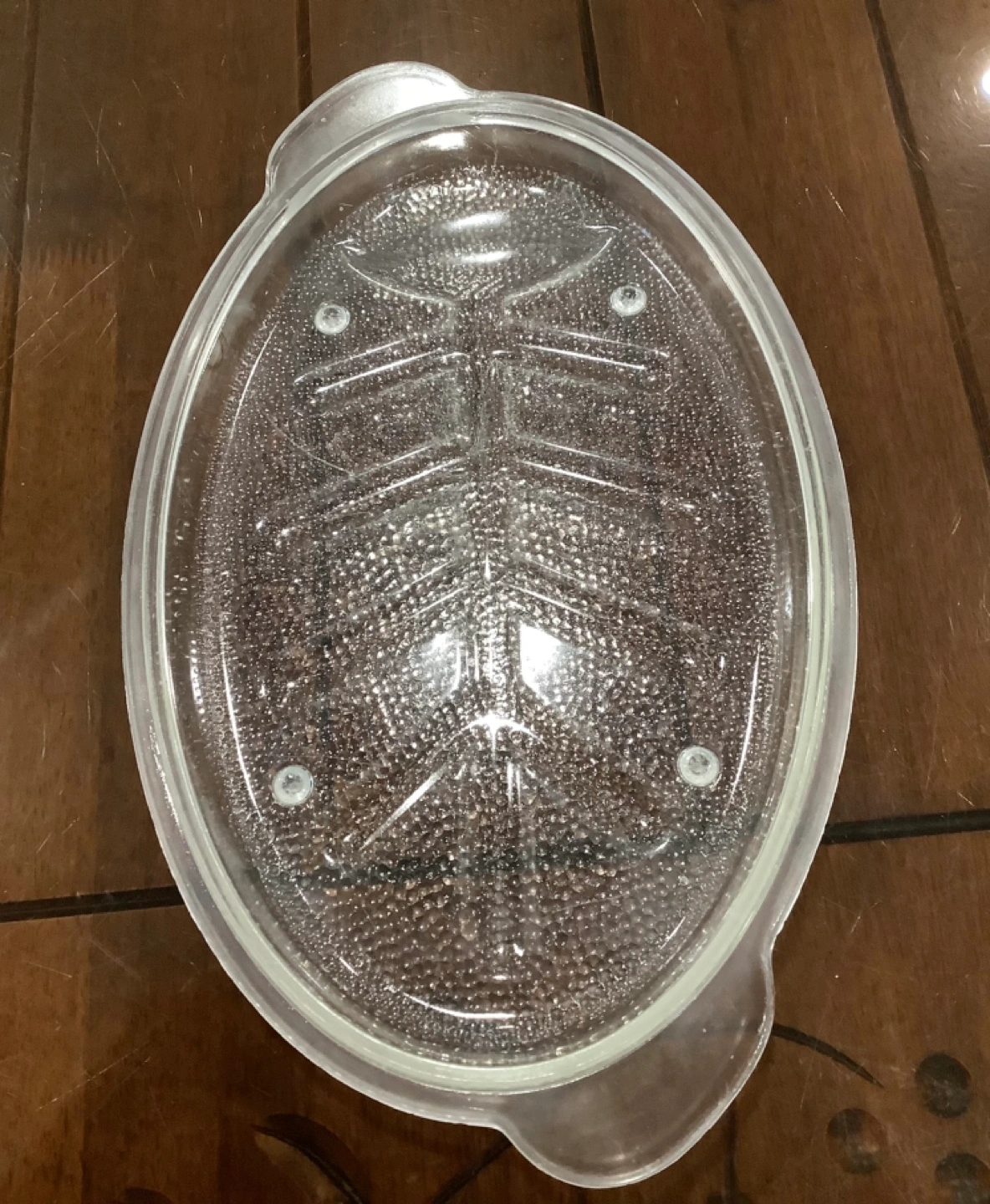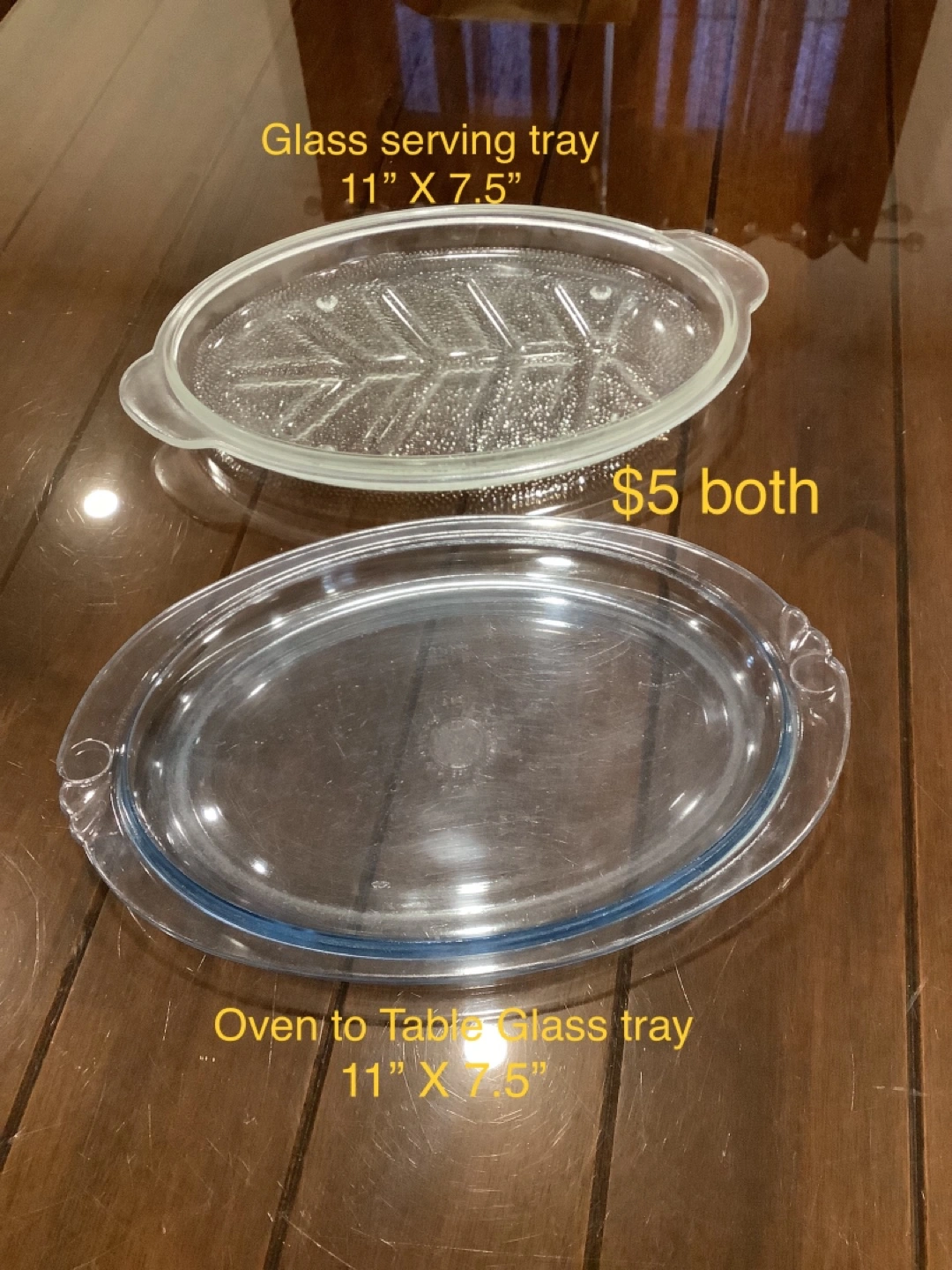 Two vintage glass dishes. One features a fishbone design. Both are oven-to-table and measure 11" x 7.5". Perfect for serving or baking.