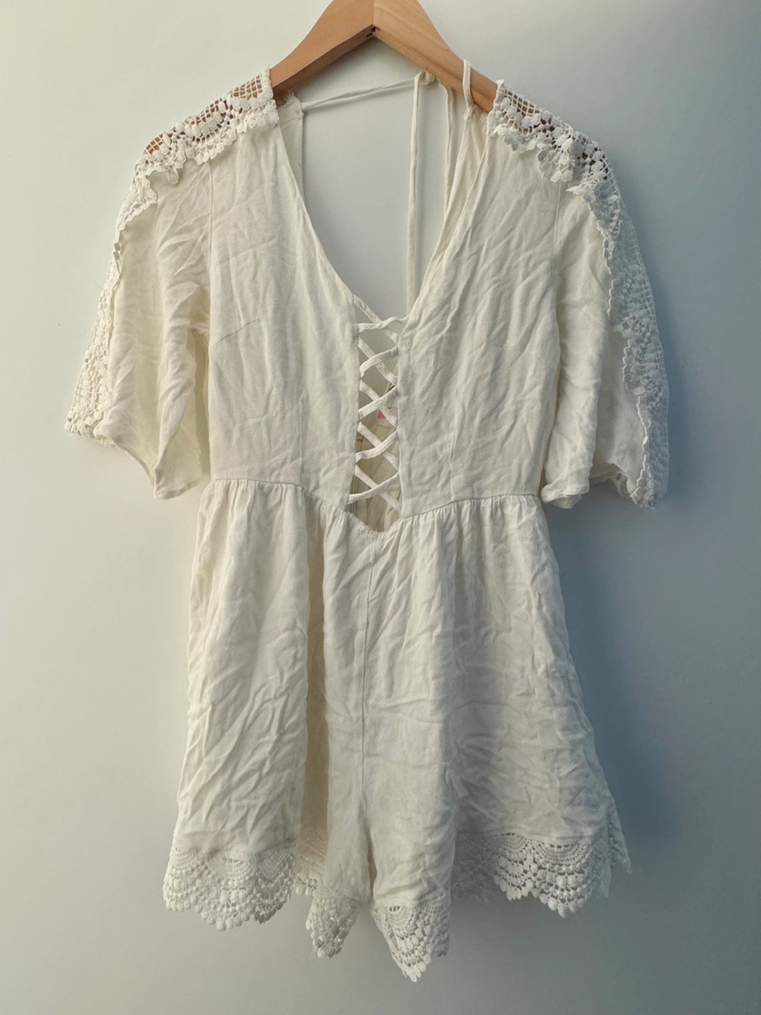 In good condition! White romper with lace detailing along the ends and lace up at the front. Great for spring and summer! 100% cotton. Price is firm, cash only please. Pickup downtown Toronto/Jarvis & Gerrard/Yonge & Dundas or we can arrange to meet along TTC line 1.
