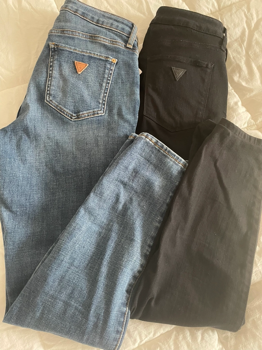 Two pairs of Guess jeans. One light wash, one black. Excellent condition. Size not specified.