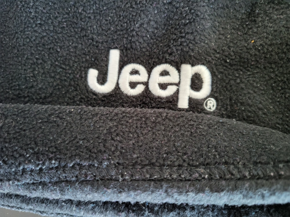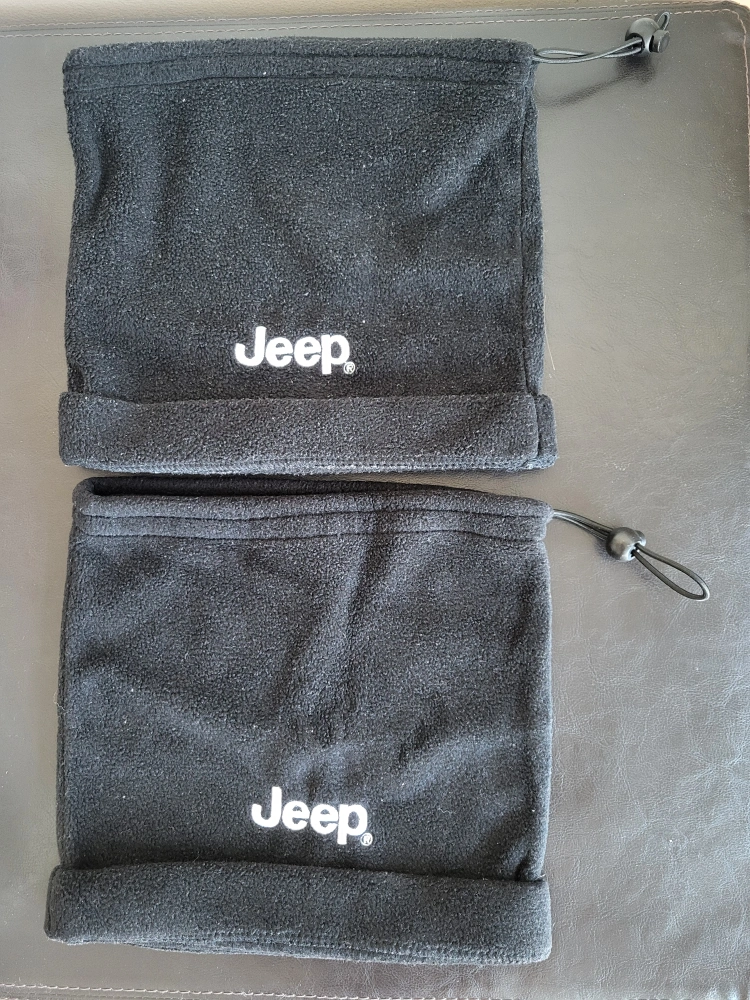 Black fleece neck gaiter with adjustable drawstring and the Jeep logo.
