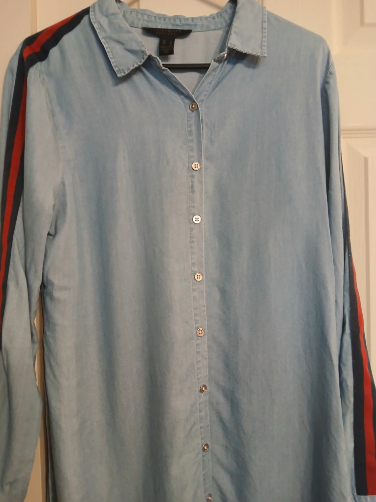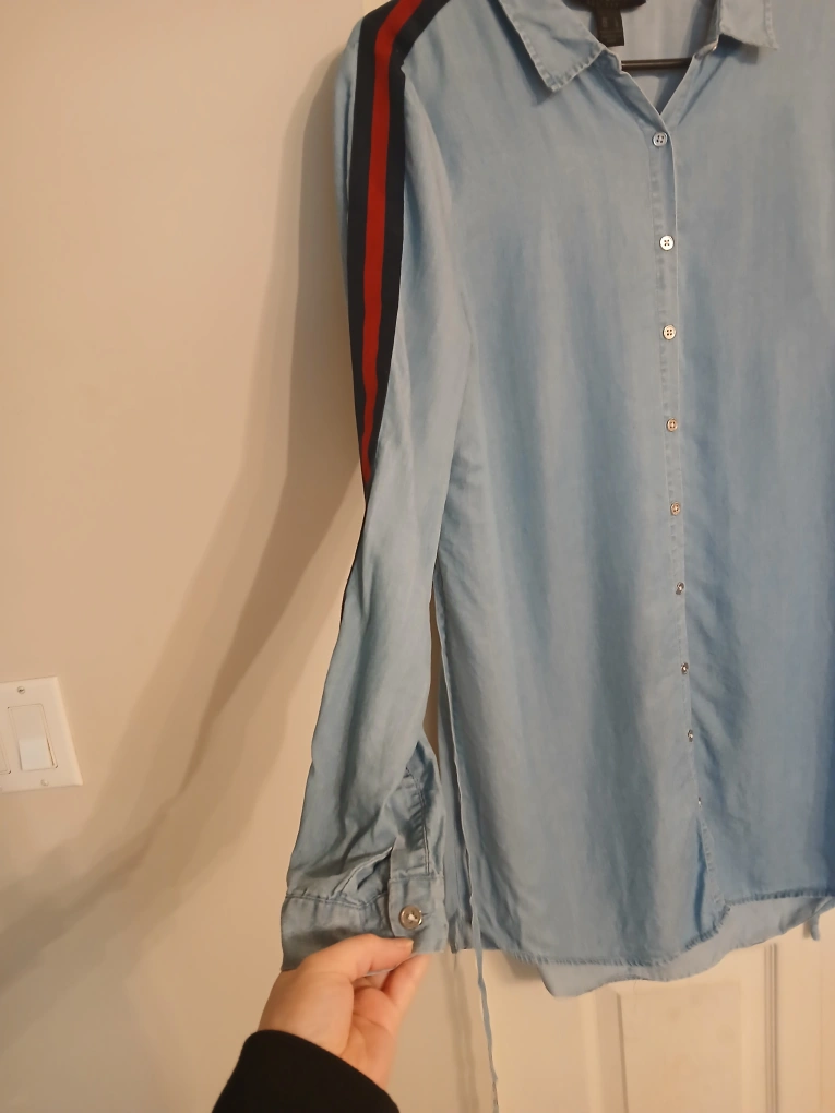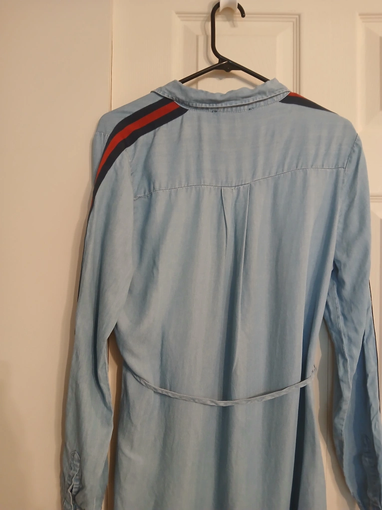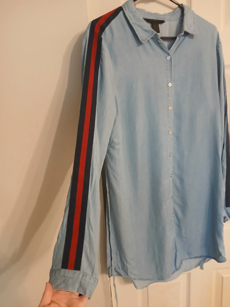 Colour: Light blue (light jean colour) with dark navy blue/black and red stripes along the arms