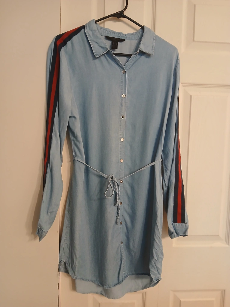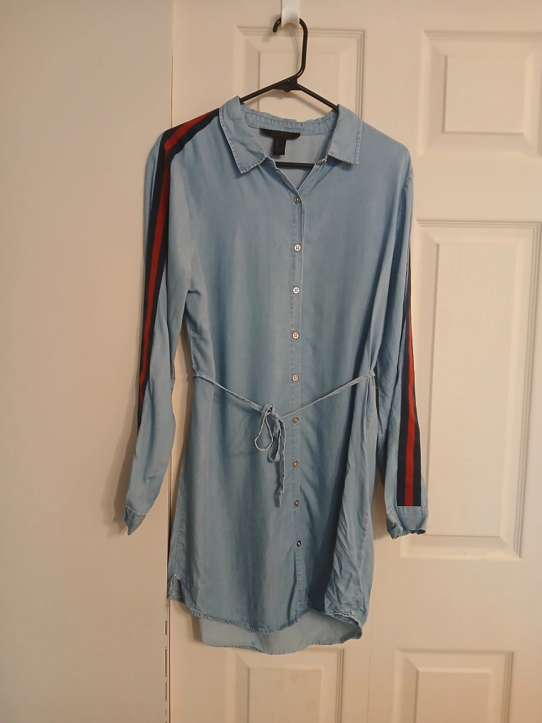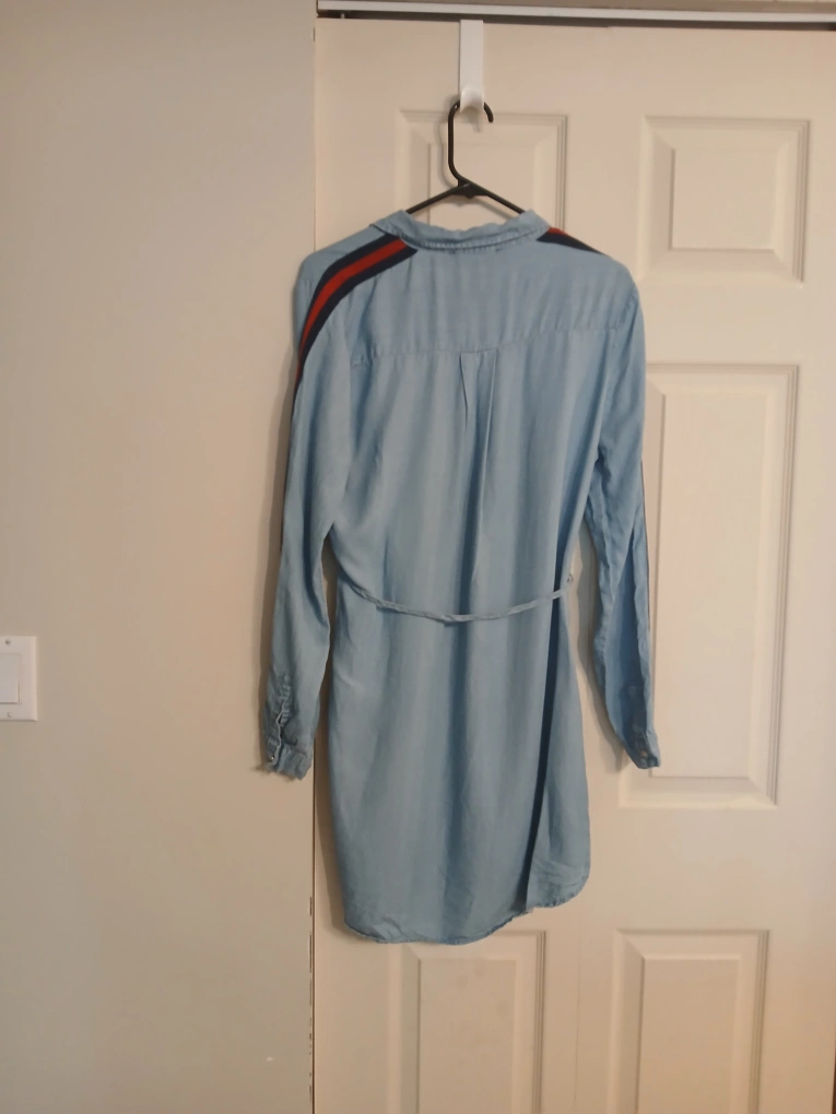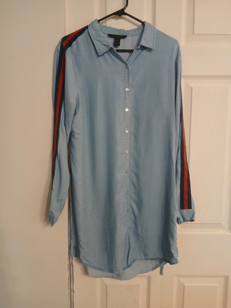 Colour: Light blue (light jean colour) with dark navy blue/black and red stripes along the arms