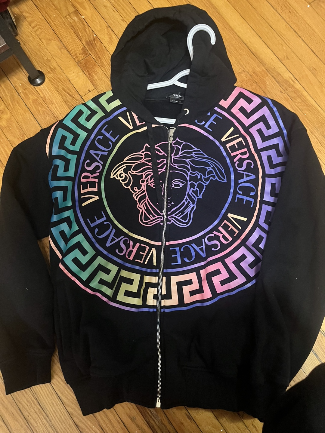 Men's black zip-up hoodie. Features a large, colourful Medusa head logo on the front. Mitchel fit. Made in Italy. 100% cotton.