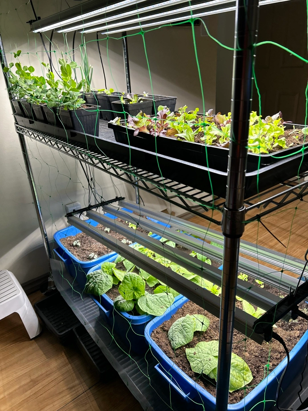 Indoor gardening setup. Includes a three-tier metal shelving unit, LED grow lights, various containers and trays for seedlings.
