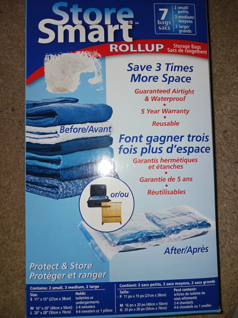 7 reusable storage bags. Save space and protect your belongings. Airtight and waterproof. Includes 2 small, 3 medium, and 2 large bags. 5-year warranty.