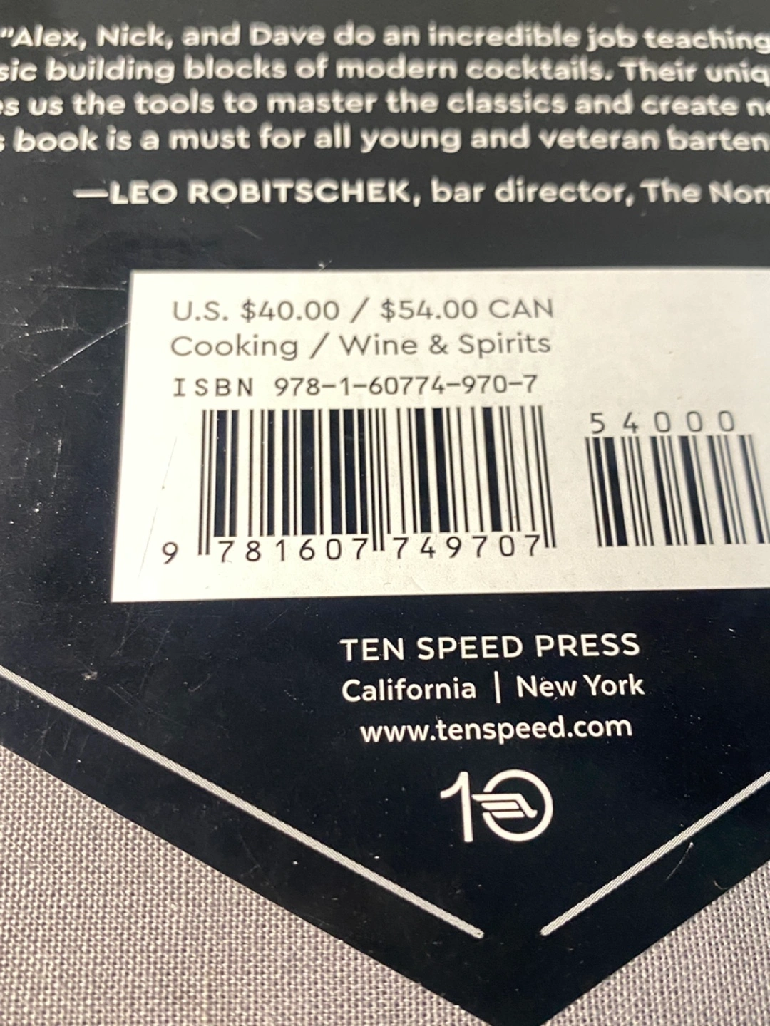 Cocktail recipe book. Gray linen-like hardcover. Published by Ten Speed Press. Includes fundamentals, formulas, and evolutions of cocktails. Beautiful photos and delicious recipes! Original retail price $40.00. Pickup on Astoria Blvd South.